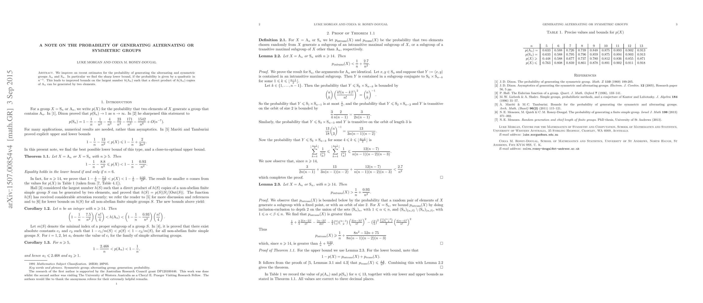 We improve on recent estimates for the probability of generating the alternating and symmetric groups $\mathrm{Alt}(n)$ and $\mathrm{Sym}(n)$. In particular we find the sharp lower bound, if the probability is given by a quadratic in $n^{-1}$. This leads to improved bounds on the largest number $h(\mathrm{Alt}(n))$ such that a direct product of $h(\mathrm{Alt}(n))$ copies of $\mathrm{Alt}(n)$ can be generated by two elements.