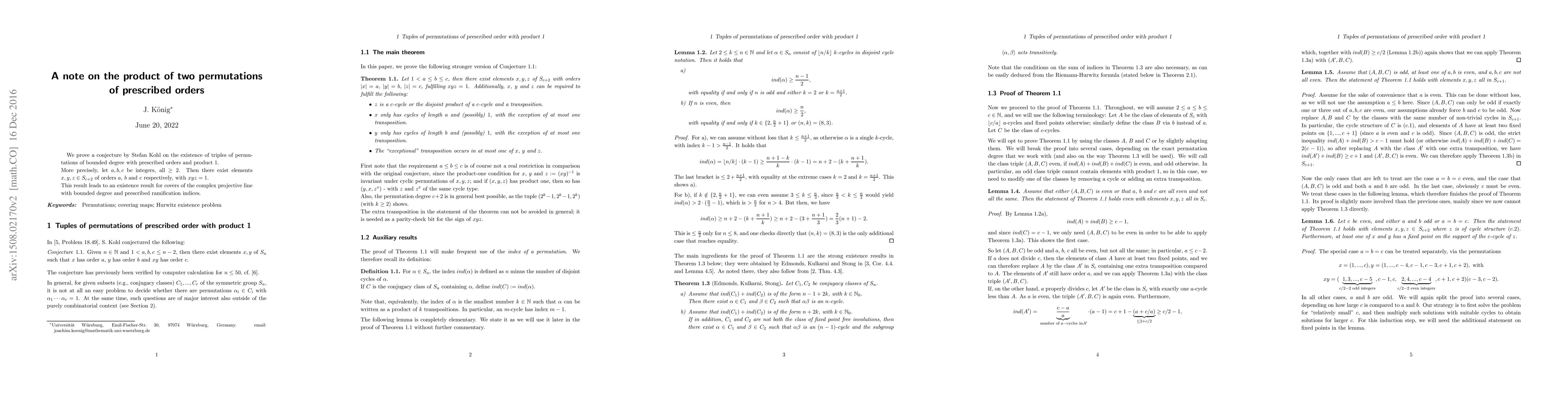 We prove a conjecture by Stefan Kohl on the existence of triples of permutations of bounded degree with prescribed orders and product 1. This result leads to an existence result for covers of the complex projective line with bounded degree and prescribed ramification indices.