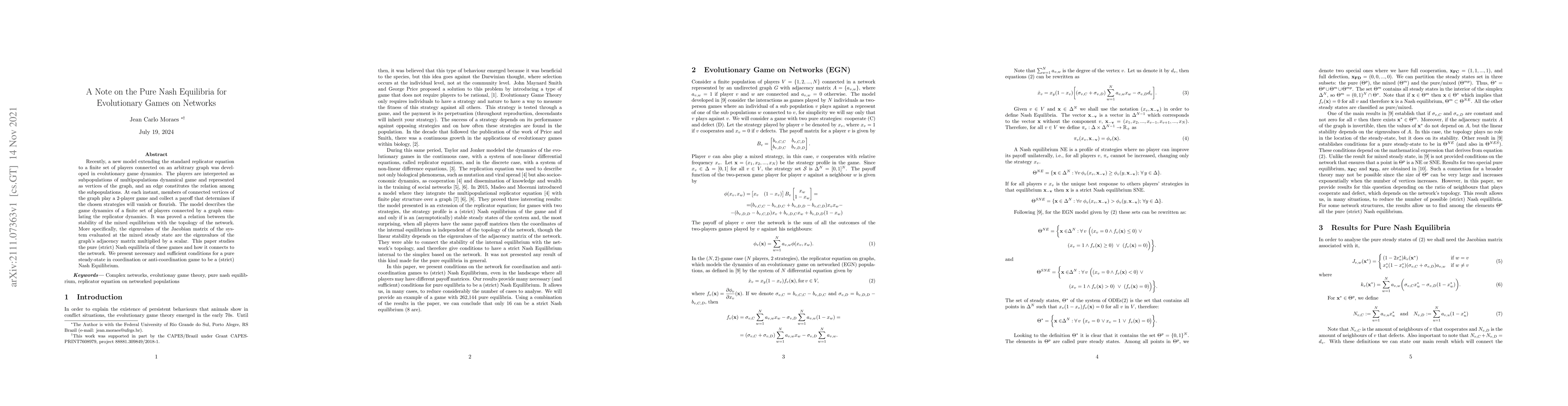 Recently, a new model extending the standard replicator equation to a finite set of players connected on an arbitrary graph was developed in evolutionary game dynamics. The players are interpreted as subpopulations of multipopulations dynamical game and represented as vertices of the graph, and an edge constitutes the relation among the subpopulations. At each instant, members of connected vertices of the graph play a 2-player game and collect a payoff that determines if the chosen strategies will vanish or flourish. The model describes the game dynamics of a finite set of players connected by a graph emulating the replicator dynamics. It was proved a relation between the stability of the mixed equilibrium with the topology of the network. More specifically, the eigenvalues of the Jacobian matrix of the system evaluated at the mixed steady state are the eigenvalues of the graph's adjacency matrix multiplied by a scalar. This paper studies the pure (strict) Nash equilibria of these games and how it connects to the network. We present necessary and sufficient conditions for a pure steady-state in coordination or anti-coordination game to be a (strict) Nash Equilibrium.