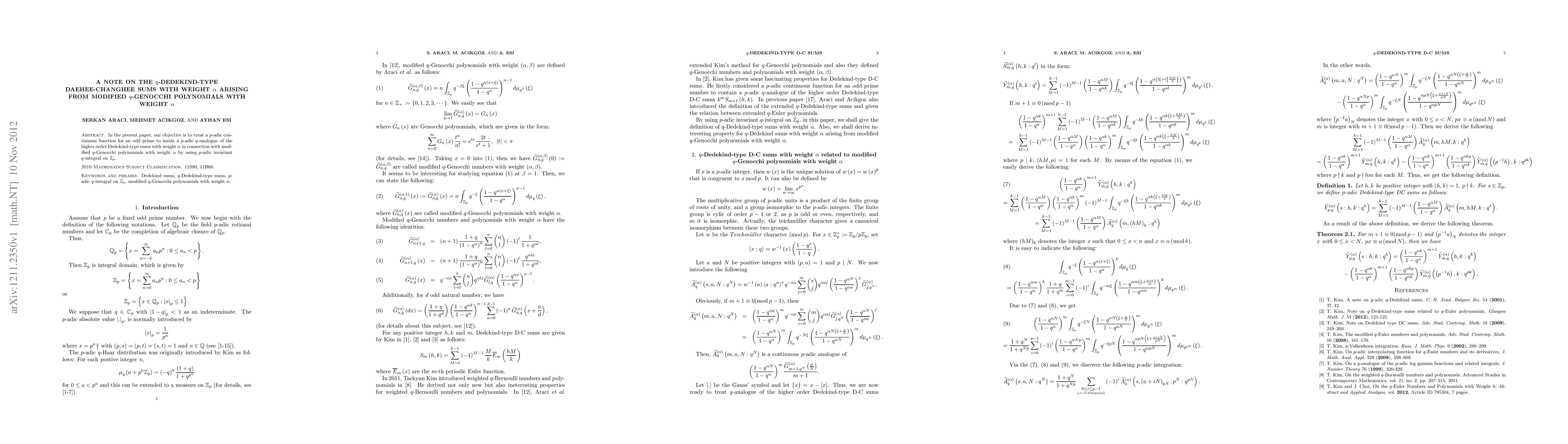 Summary: This paper explores p-adic continuous functions related to modified q-Genocchi polynomials, focusing on higher order Dedekind-type sums with weight alpha using a p-adic invariant q-integral on Zp. The study employs a p-adic q-analogue framework.