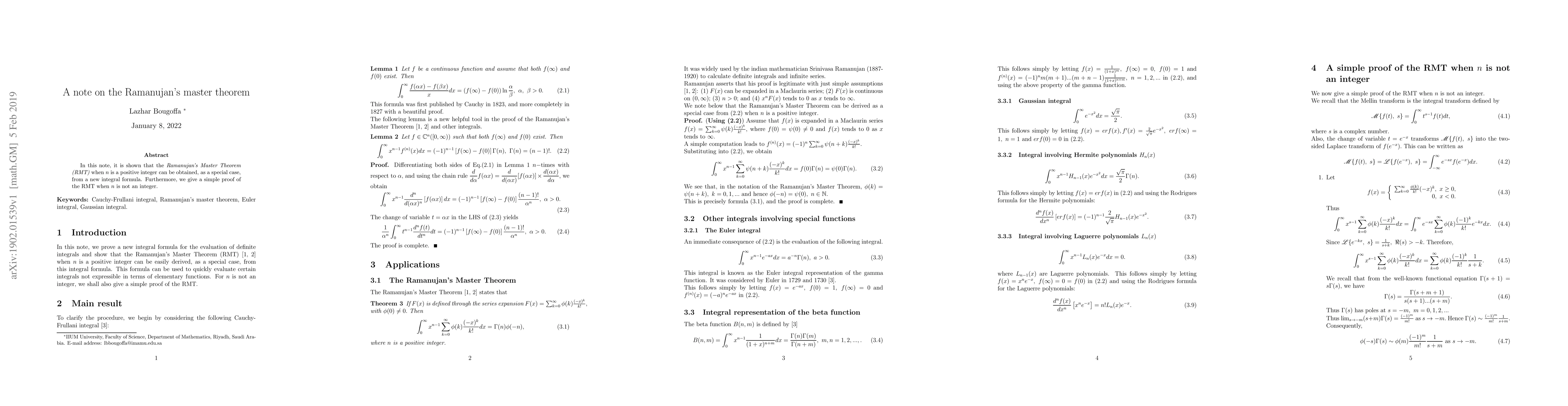Summary: This paper demonstrates that the Ramanujan Master Theorem can be derived from a new integral formula, and provides a straightforward proof for cases where n is not an integer.
