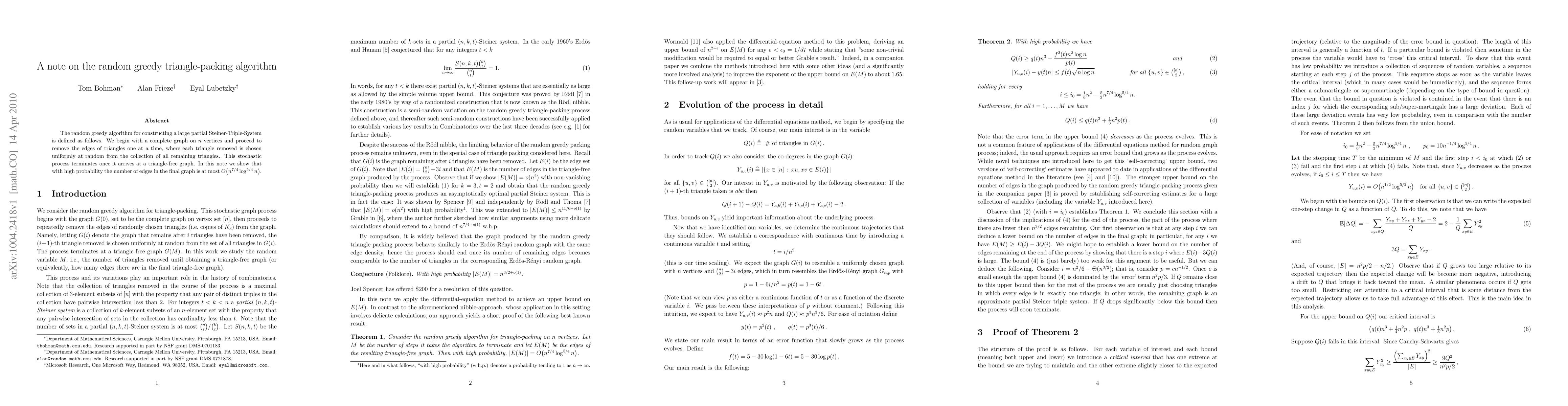 This paper examines a random greedy algorithm for constructing a large partial Steiner-Triple-System by removing triangles from a complete graph until a triangle-free graph remains. It demonstrates that, with high probability, the final graph contains at most $O(n^{7/4}\log^{5/4}n)$ edges.