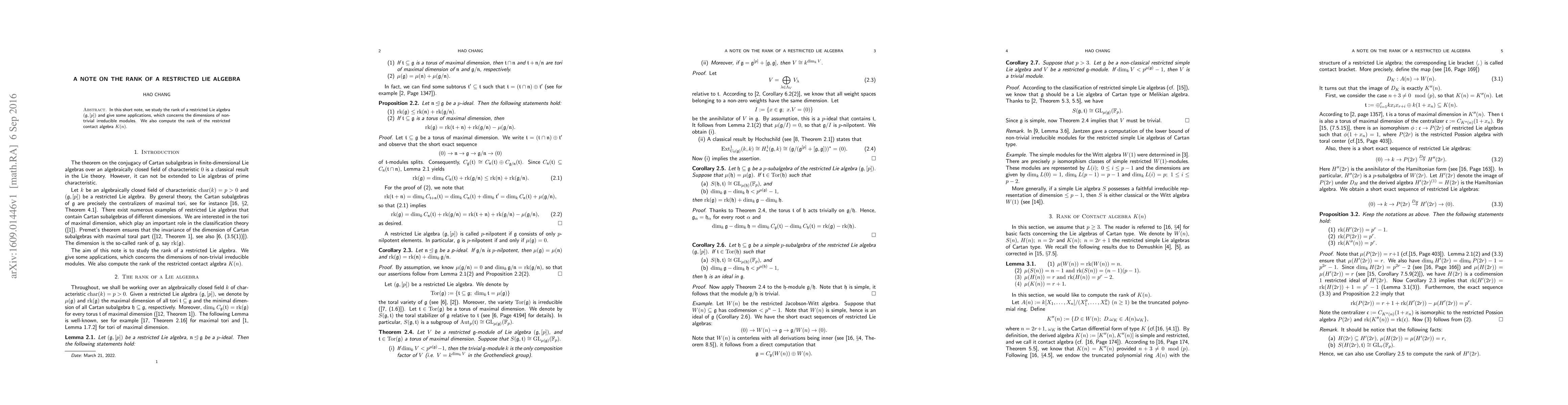 In this short note, we study the rank of a restricted Lie algebra $(\mathfrak{g},[p])$ and give some applications, which concerns the dimensions of non-trivial irreducible modules. We also compute the rank of the restricted contact algebra $K(n)$.