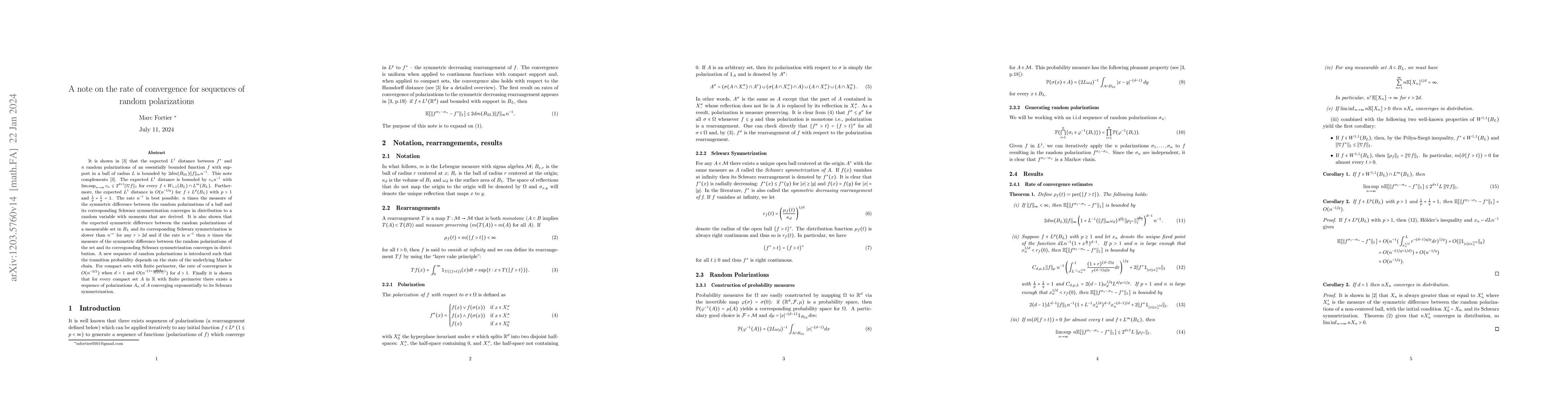 This paper extends results on the rate of convergence for random polarizations of functions, showing that the expected $L^1$ distance converges as $O(n^{-1/q})$ for $f \in L^p(B_L)$ with $p>1$. It establishes that the convergence rate $n^{-1}$ is optimal, introduces new random polarizations with state-dependent transition probabilities, and provides convergence rates for compact sets with finite perimeter.