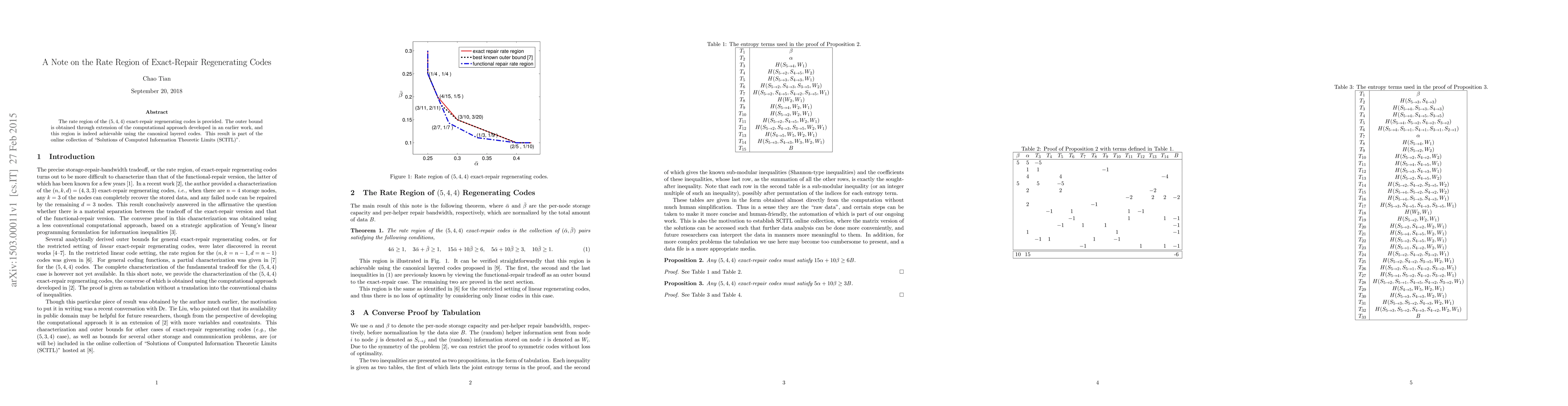 The rate region of the $(5,4,4)$ exact-repair regenerating codes is provided. The outer bound is obtained through extension of the computational approach developed in an earlier work, and this region is indeed achievable using the canonical layered codes. This result is part of the online collection of "Solutions of Computed Information Theoretic Limits (SCITL)".