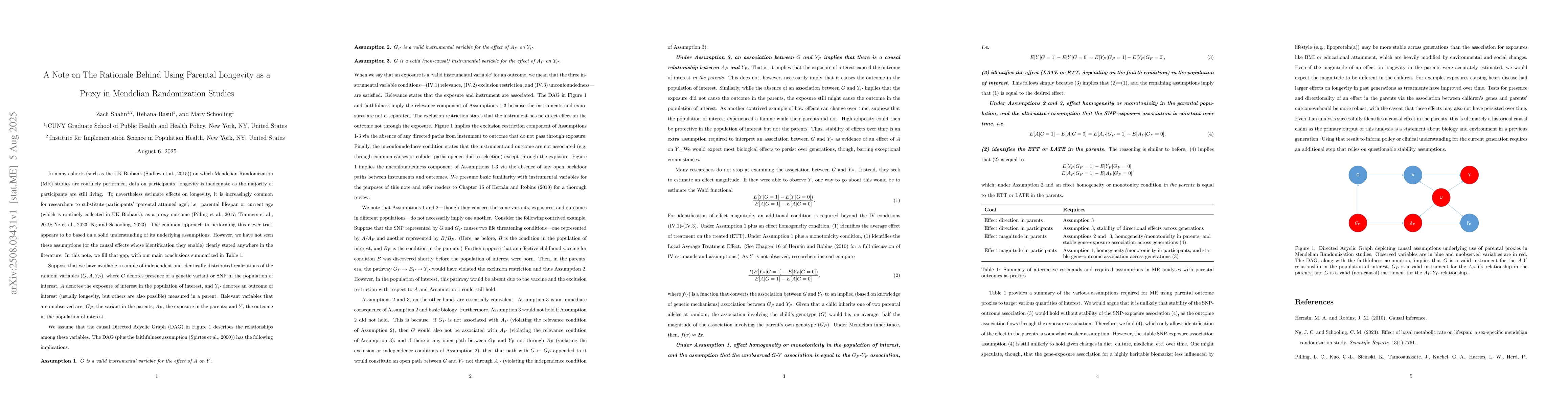 In many cohorts (such as the UK Biobank) on which Mendelian Randomization studies are routinely performed, data on participants' longevity is inadequate as the majority of participants are still living. To nevertheless estimate effects on longevity, it is increasingly common for researchers to substitute participants' `parental attained age', i.e. parental lifespan or current age (which is routinely collected in UK Biobank), as a proxy outcome. The common approach to performing this clever trick appears to be based on a solid understanding of its underlying assumptions. However, we have not seen these assumptions (or the causal effects whose identification they enable) clearly stated anywhere in the literature. In this note, we fill that gap.