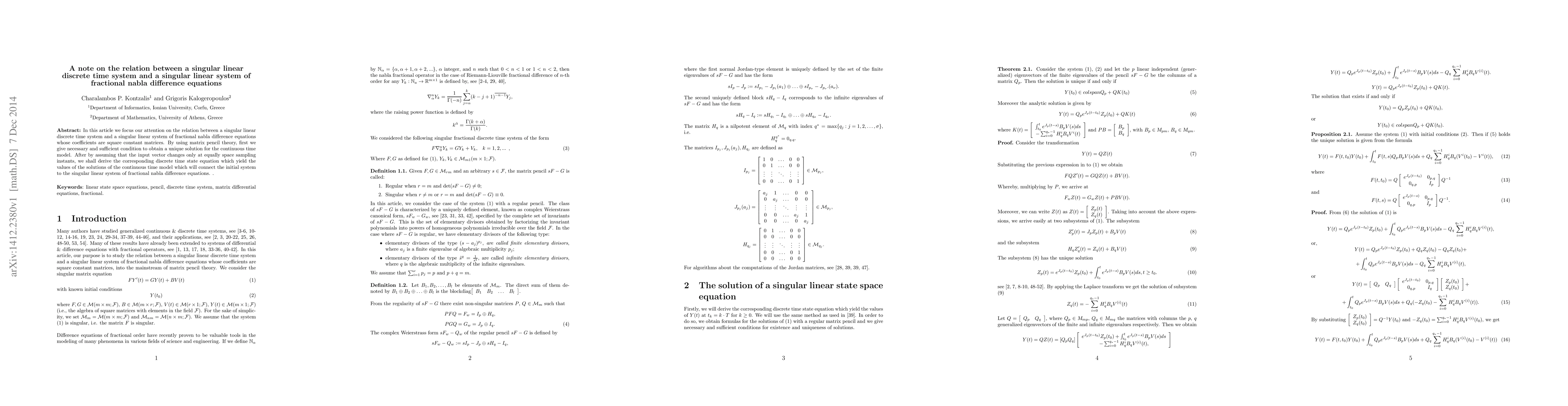 This paper explores the relationship between a singular linear discrete time system and a singular linear system of fractional nabla difference equations. It establishes necessary and sufficient conditions for a unique solution using matrix pencil theory and derives a corresponding discrete time state equation to connect the initial system to the fractional difference equations.