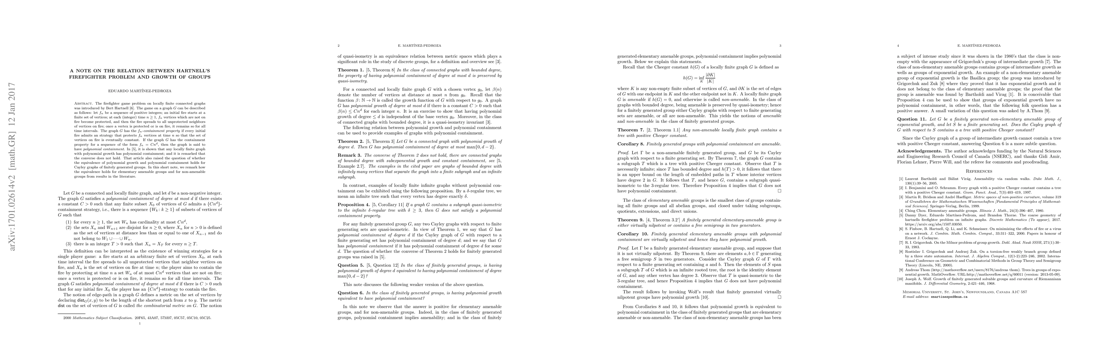 The paper examines the relationship between Hartnell's firefighter problem and growth of groups, showing that polynomial containment holds for elementary amenable and non-amenable groups.