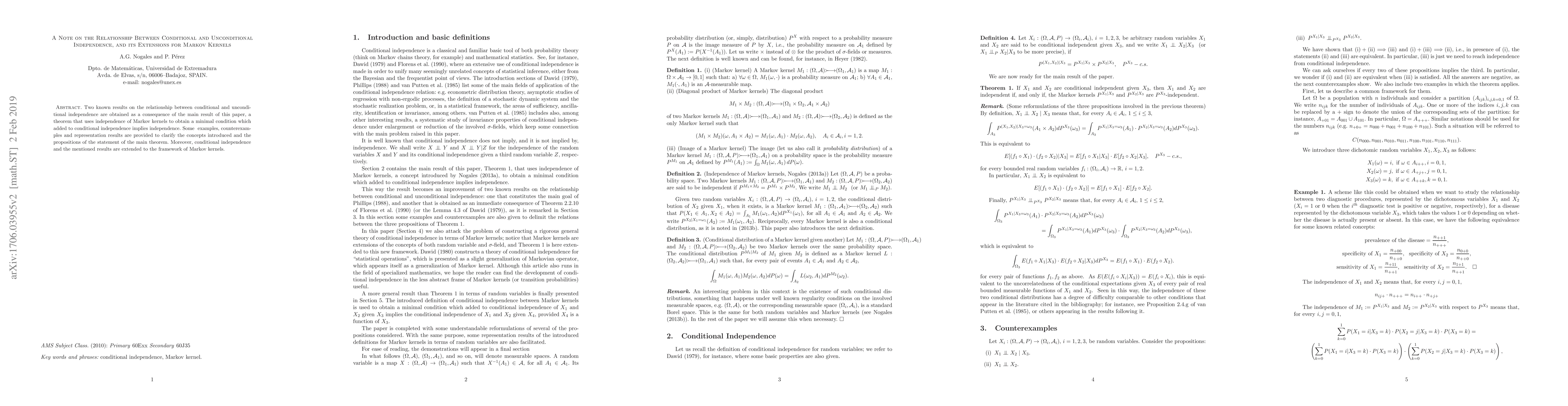 This paper establishes a minimal condition using Markov kernel independence that, when added to conditional independence, implies unconditional independence. It also extends these concepts to the framework of Markov kernels, providing counterexamples and representation results to clarify the relationships.