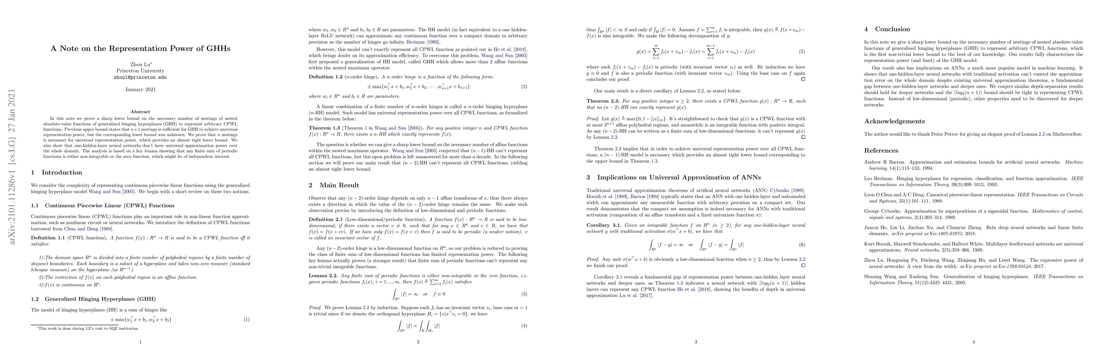 In this note we prove a sharp lower bound on the necessary number of nestings of nested absolute-value functions of generalized hinging hyperplanes (GHH) to represent arbitrary CPWL functions. Previous upper bound states that $n+1$ nestings is sufficient for GHH to achieve universal representation power, but the corresponding lower bound was unknown. We prove that $n$ nestings is necessary for universal representation power, which provides an almost tight lower bound. We also show that one-hidden-layer neural networks don't have universal approximation power over the whole domain. The analysis is based on a key lemma showing that any finite sum of periodic functions is either non-integrable or the zero function, which might be of independent interest.