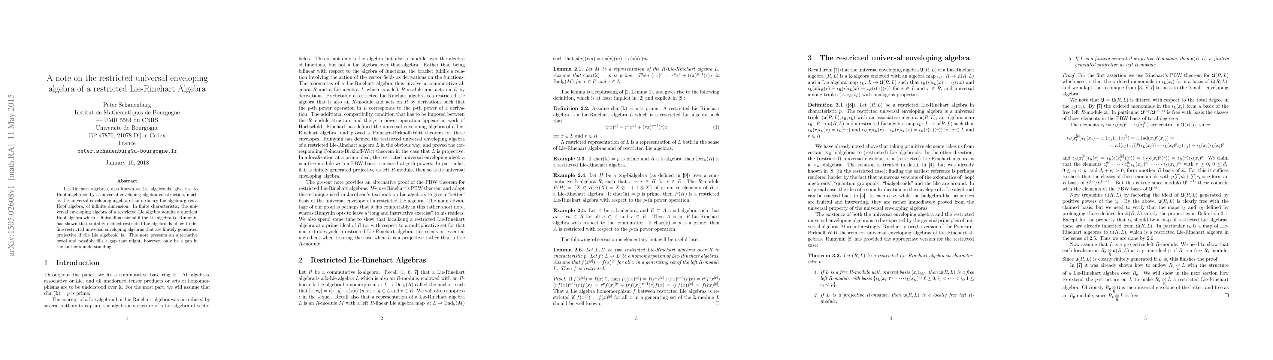 Lie-Rinehart algebras, also known as Lie algebroids, give rise to Hopf algebroids by a universal enveloping algebra construction, much as the universal enveloping algebra of an ordinary Lie algebra gives a Hopf algebra, of infinite dimension. In finite characteristic, the universal enveloping algebra of a restricted Lie algebra admits a quotient Hopf algebra which is finite-dimensional if the Lie algebra is. Rumynin has shown that suitably defined restricted Lie algebroids allow to define restricted universal enveloping algebras that are finitely generated projective if the Lie algebroid is. This note presents an alternative proof and possibly fills a gap that might, however, only be a gap in the author's understanding.
