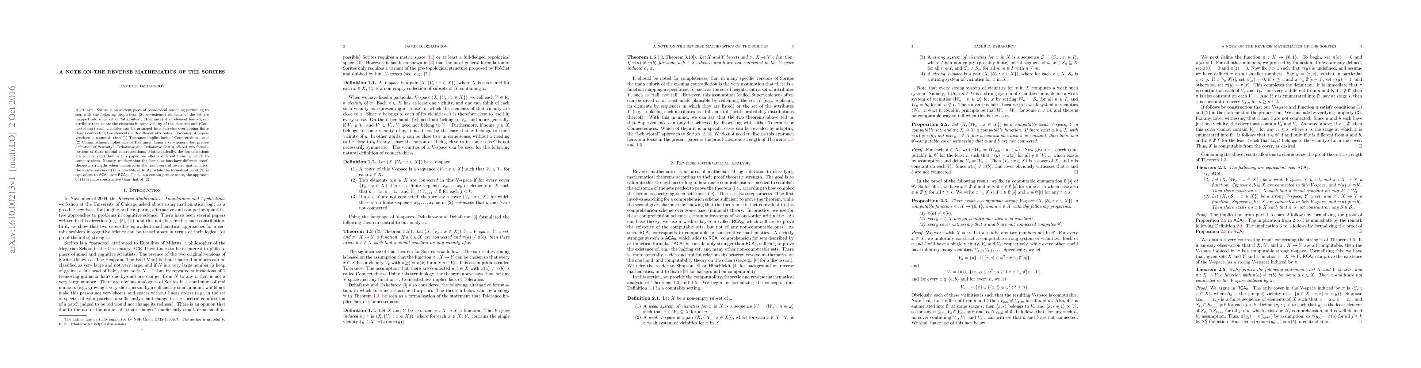 Sorites is an ancient piece of paradoxical reasoning pertaining to sets with the following properties: (Supervenience) elements of the set are mapped into some set of "attributes", (Tolerance) if an element has a given attribute then so are the elements in some vicinity of this element, and (Connectedness) such vicinities can be arranged into pairwise overlapping finite chains connecting two elements with different attributes. Obviously, if Superveneince is assumed, then (1) Tolerance implies lack of Connectedness, and (2) Connectedness implies lack of Tolerance. Using a very general but precise definition of "vicinity", Dzhafarov and Dzhafarov (2010) offered two formalizations of these mutual contrapositions. Mathematically, the formalizations are equally valid, but in this paper, we offer a different basis by which to compare them. Namely, we show that the formalizations have different proof-theoretic strengths when measured in the framework of reverse mathematics: the formalization of (1) is provable in $\mathsf{RCA}_0$, while the formalization of (2) is equivalent to $\mathsf{ACA}_0$ over $\mathsf{RCA}_0$. Thus, in a certain precise sense, the approach of (1) is more constructive than that of (2).