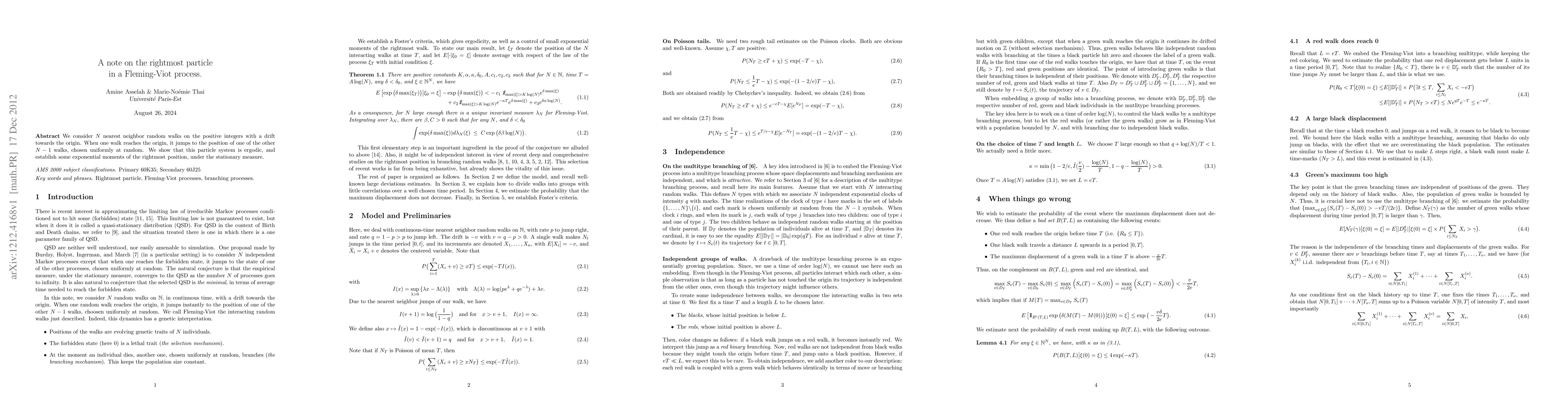 We consider N nearest neighbor random walks on the positive integers with a drift towards the origin. When one walk reaches the origin, it jumps to the position of one of the other N-1 walks, chosen uniformly at random. We show that this particle system is ergodic, and establish some exponential moments of the rightmost position, under the stationary measure.