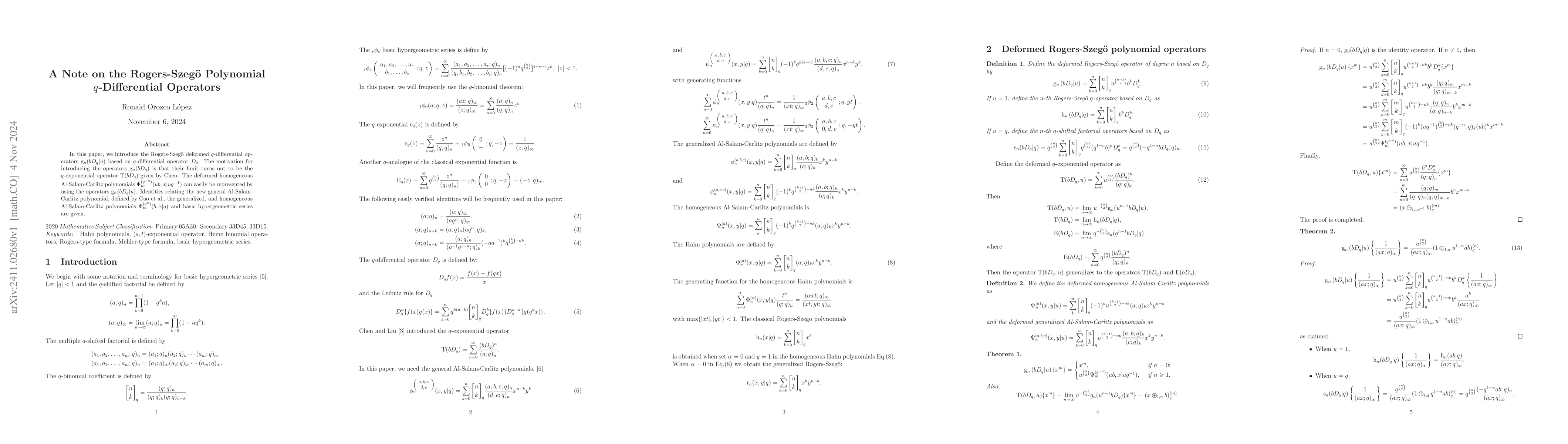 This paper introduces new Rogers-Szegő deformed $q$-differential operators $g_{n}(bD_{q}|u)$ based on $D_{q}$, showing their limit corresponds to Chen's $q$-exponential operator $T(bD_{q})$. It also establishes identities relating these operators to deformed Al-Salam-Carlitz polynomials and basic hypergeometric series.