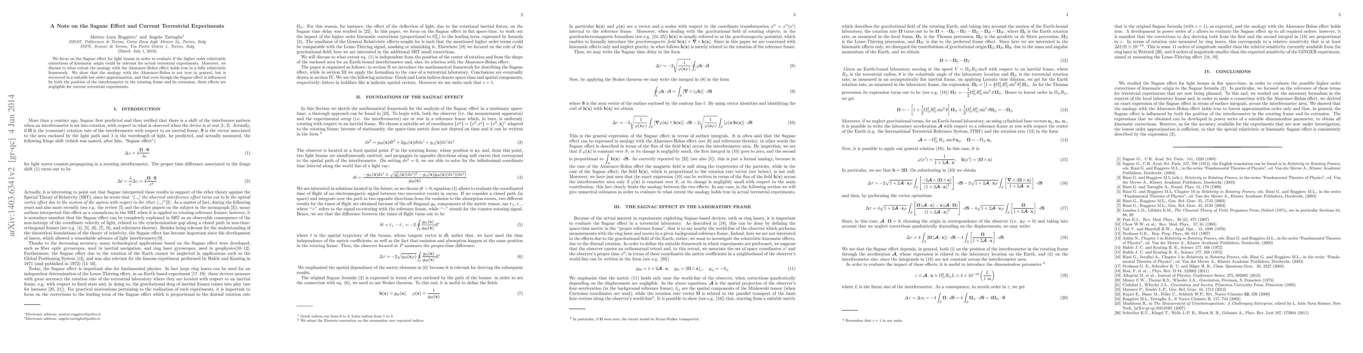We focus on the Sagnac effect for light beams in order to evaluate if the higher order relativistic corrections of kinematic origin could be relevant for actual terrestrial experiments. Moreover, we discuss to what extent the analogy with the Aharonov-Bohm effect holds true in a fully relativistic framework. We show that the analogy with the Aharonov-Bohm is not true in general, but is recovered in a suitable low order approximation, and that even though the Sagnac effect is influenced by both the position of the interferometer in the rotating frame and its extension, these effects are negligible for current terrestrial experiments.