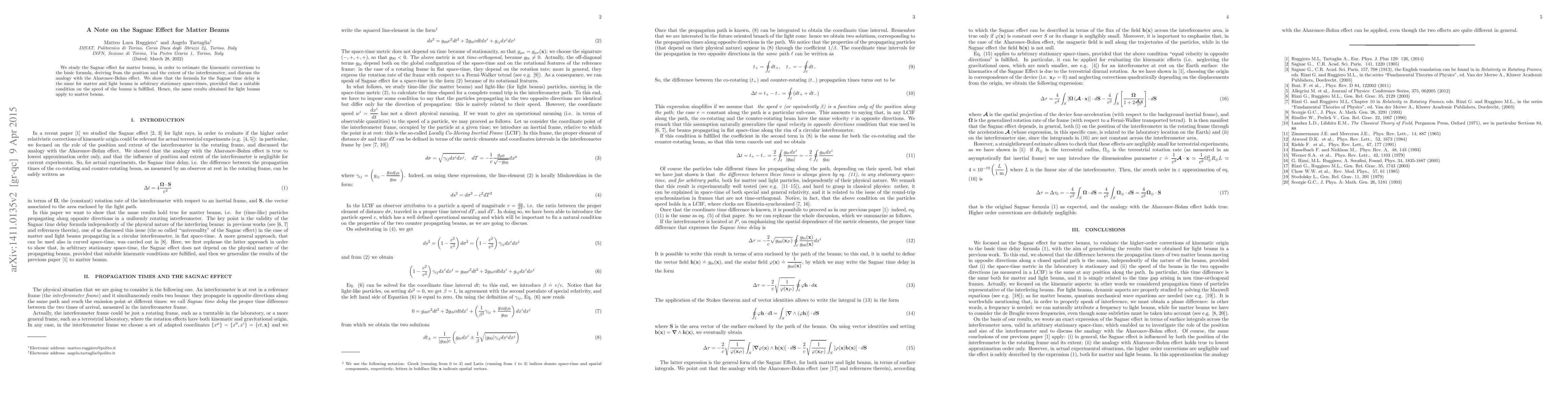 This paper investigates the Sagnac effect for matter beams, revealing that the time delay formula is identical for both matter and light beams in stationary space-times, provided the beams' speed meets a specific condition. The study also draws parallels to the Aharonov-Bohm effect.