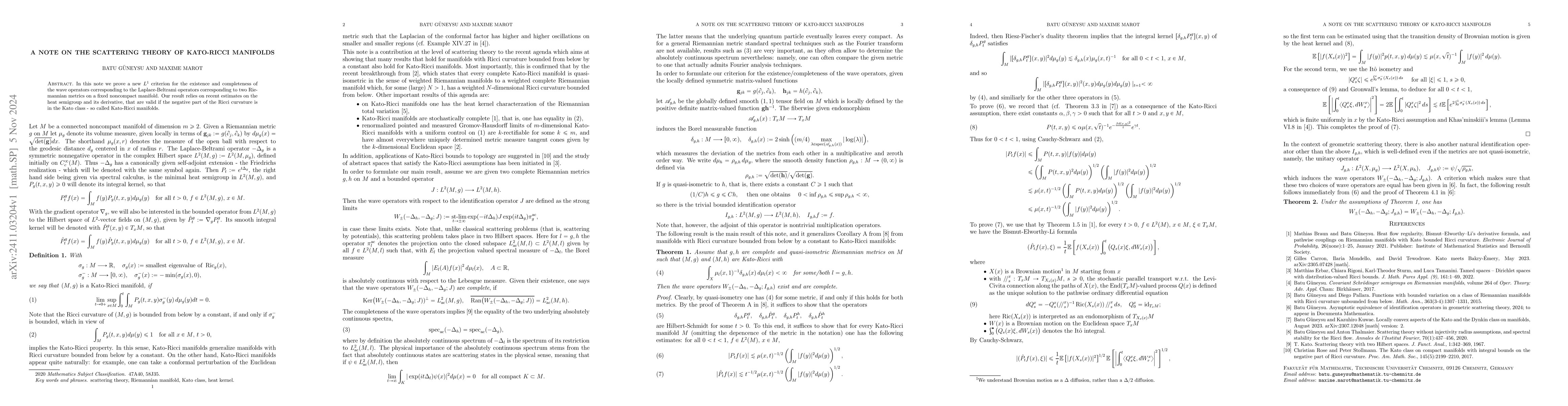 In this note we prove a new $L^1$ criterion for the existence and completeness of the wave operators corresponding to the Laplace-Beltrami operators corresponding to two Riemannian metrics on a fixed noncompact manifold. Our result relies on recent estimates on the heat semigroup and its derivative, that are valid if the negative part of the Ricci curvature is in the Kato class - so called Kato-Ricci manifolds.