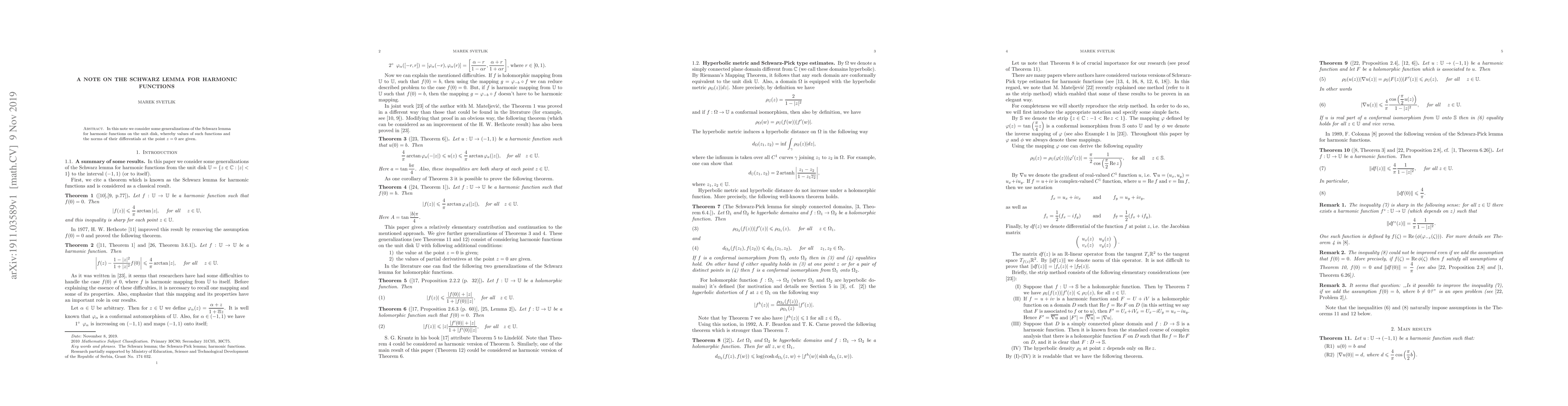 Summary: This paper explores generalizations of the Schwarz lemma for harmonic functions defined on the unit disk, focusing on the values of these functions and the norms of their differentials at the origin. The study provides new insights into the behavior of harmonic functions under these conditions.