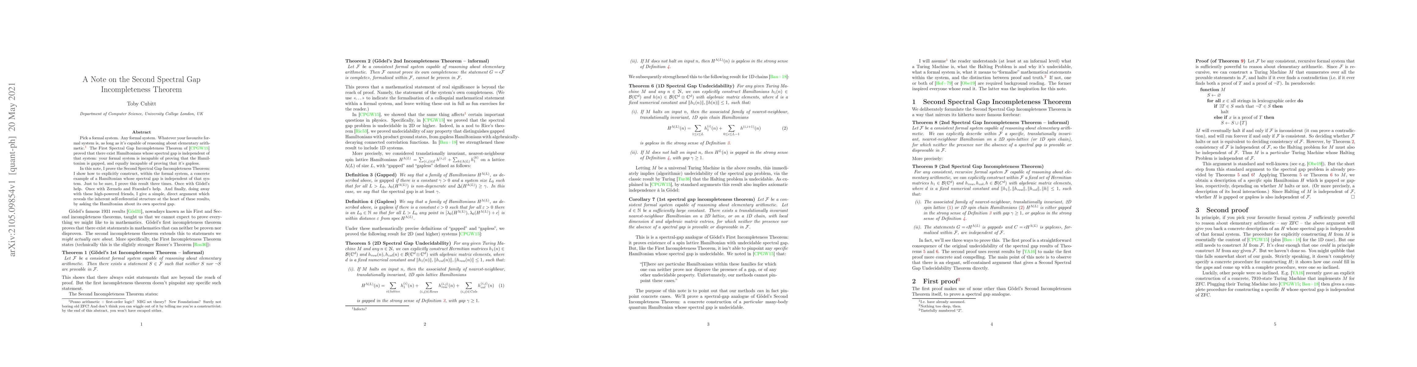 Pick a formal system. Any formal system. Whatever your favourite formal system is, as long as it's capable of reasoning about elementary arithmetic. The First Spectral Gap Incompleteness Theorem of [CPGW15] proved that there exist Hamiltonians whose spectral gap is independent of that system; your formal system is incapable of proving that the Hamiltonian is gapped, and equally incapable of proving that it's gapless. In this note, I prove a Second Spectral Gap Incompleteness Theorem: I show how to explicitly construct, within the formal system, a concrete example of a Hamiltonian whose spectral gap is independent of that system. Just to be sure, I prove this result three times. Once with G\"odel's help. Once with Zermelo and Fraenkel's help. And finally, doing away with these high-powered friends, I give a simple, direct argument which reveals the inherent self-referential structure at the heart of these results, by asking the Hamiltonian about its own spectral gap.