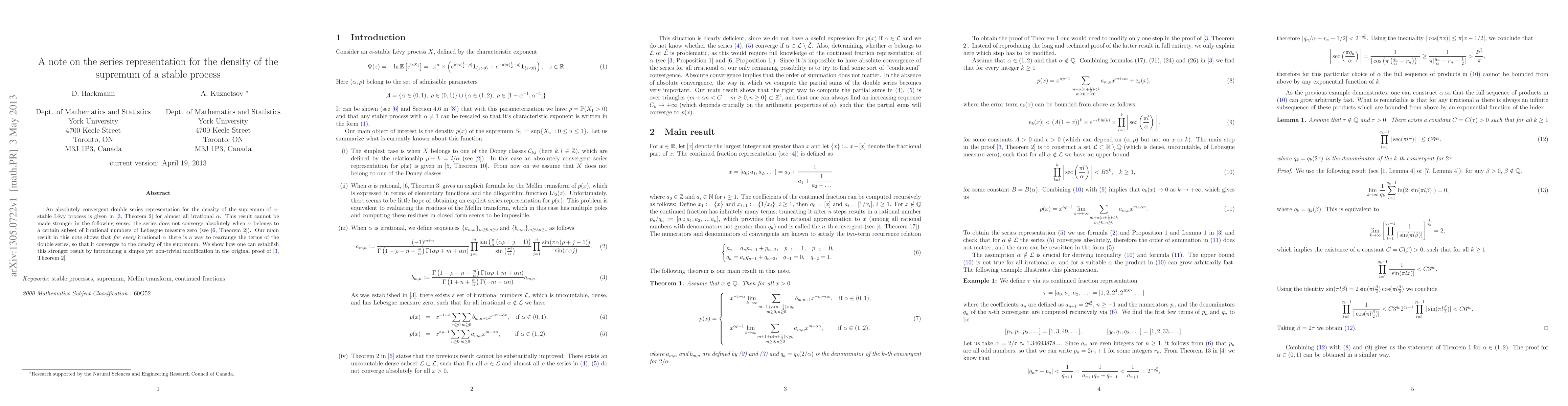 This paper presents a rearrangement of a double series representation for the density of the supremum of an $\alpha$-stable Lévy process, showing that it converges for all irrational $\alpha$. It introduces a modification to the original proof to achieve this stronger result.