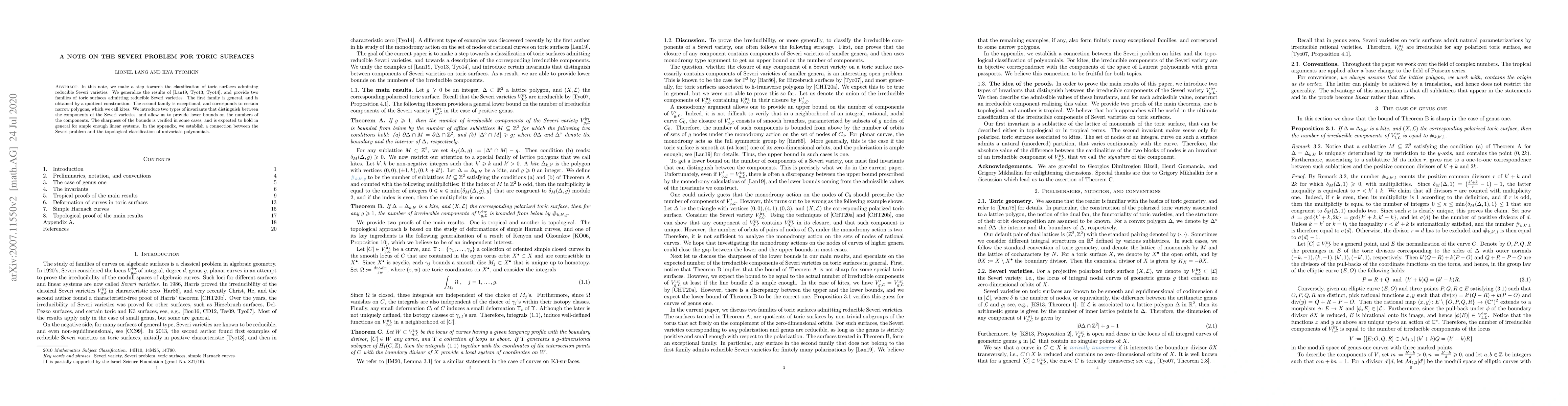 In this note, we make a step towards the classification of toric surfaces admitting reducible Severi varieties. We generalize the results of [Lan19, Tyo13, Tyo14], and provide two families of toric surfaces admitting reducible Severi varieties. The first family is general, and is obtained by a quotient construction. The second family is exceptional, and corresponds to certain narrow polygons, which we call kites. We introduce two types of invariants that distinguish between the components of the Severi varieties, and allow us to provide lower bounds on the numbers of the components. The sharpness of the bounds is verified in some cases, and is expected to hold in general for ample enough linear systems. In the appendix, we establish a connection between the Severi problem and the topological classification of univariate polynomials.