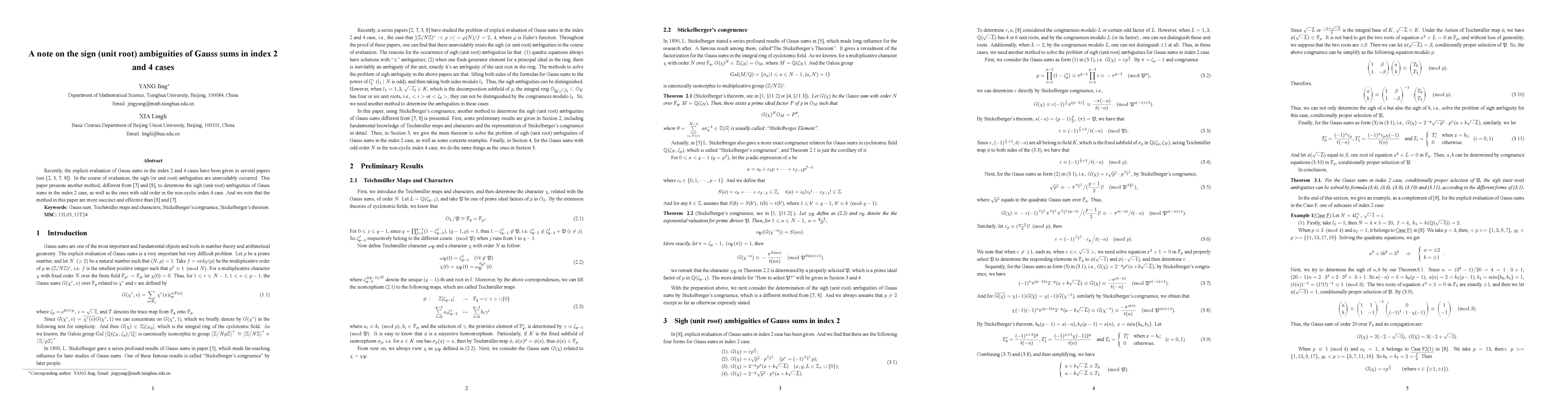 Recently, the explicit evaluation of Gauss sums in the index 2 and 4 cases have been given in several papers (see [2,3,7,8]). In the course of evaluation, the sigh (or unit root) ambiguities are unavoidably occurred. This paper presents another method, different from [7] and [8], to determine the sigh (unit root) ambiguities of Gauss sums in the index 2 case, as well as the ones with odd order in the non-cyclic index 4 case. And we note that the method in this paper are more succinct and effective than [8] and [7].