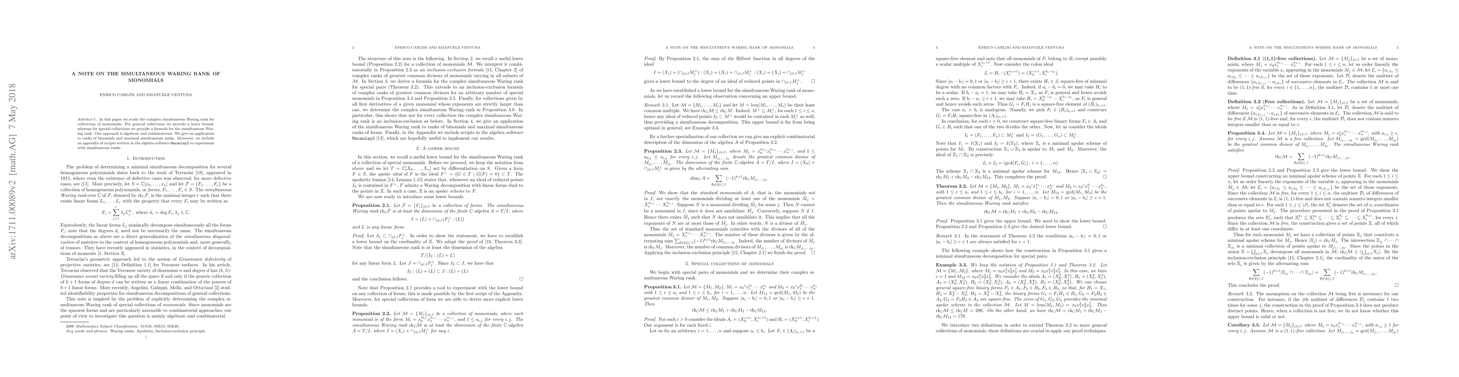 This paper explores the complex simultaneous Waring rank of collections of monomials, offering a lower bound for general collections and a formula for special cases. It applies the algebraic and combinatorial approach to determine ranks of binomials and maximal simultaneous ranks, supplemented by Macaulay2 scripts for experimentation.