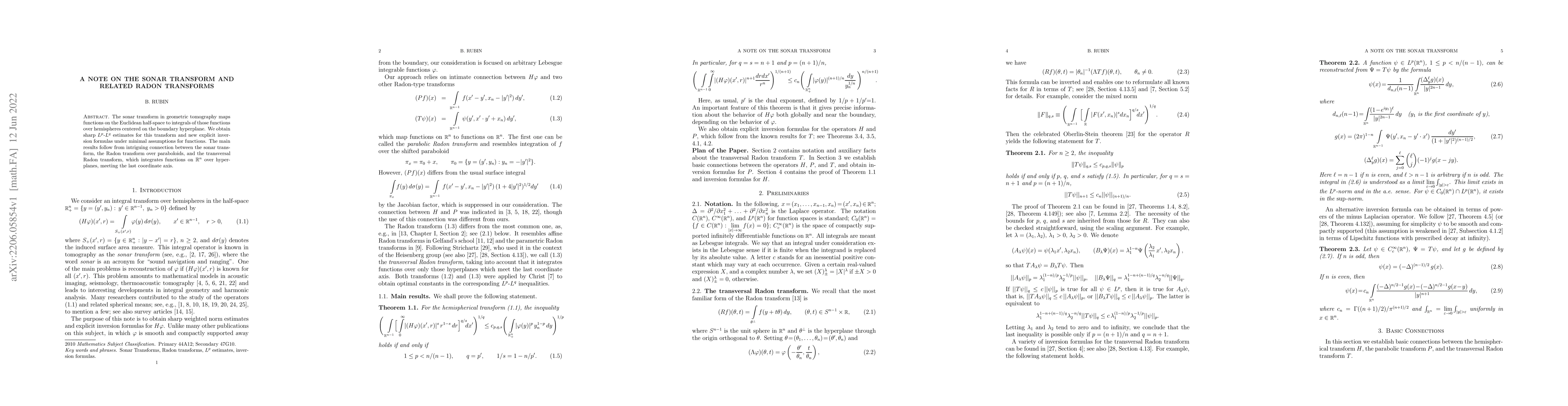 The sonar transform in geometric tomography maps functions on the Euclidean half-space to integrals of those functions over hemispheres centered on the boundary hyperplane. We obtain sharp $L^p$-$L^q$ estimates for this transform and new explicit inversion formulas under minimal assumptions for functions. The main results follow from intriguing connection between the sonar transform, the Radon transform over paraboloids, and the transversal Radon transform, which integrates functions over hyperplanes, meeting the last coordinate axis.