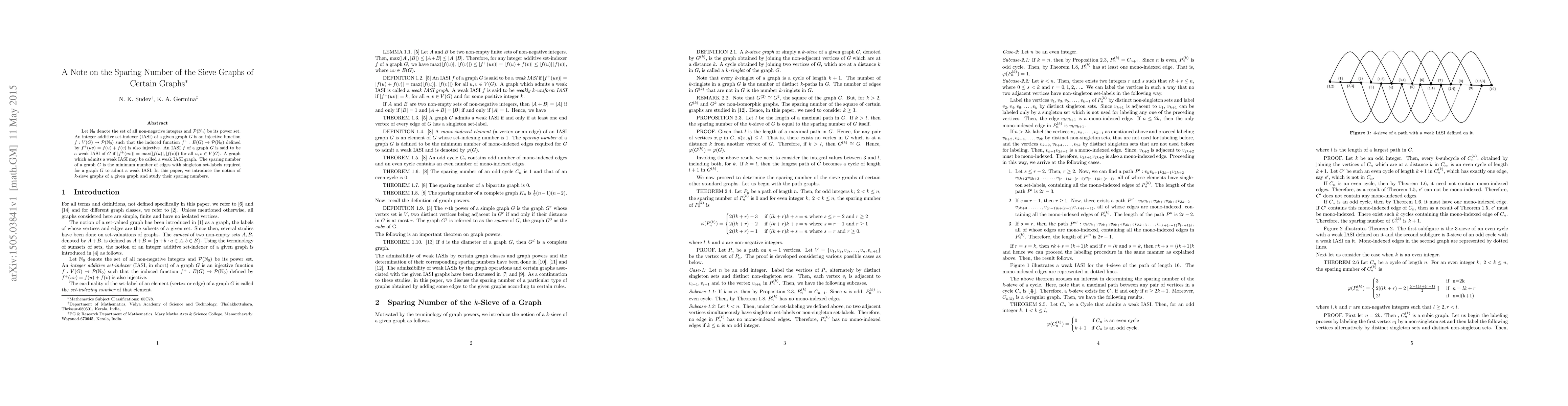 Let $\mathbb{N}_0$ denote the set of all non-negative integers and $\mathcal{P}(\mathbb{N}_0)$ be its power set. An integer additive set-indexer (IASI) of a given graph $G$ is an injective function $f:V(G)\to \mathcal{P}(\mathbb{N}_0)$ such that the induced function $f^+:E(G) \to \mathcal{P}(\mathbb{N}_0)$ defined by $f^+ (uv) = f(u)+ f(v)$ is also injective. An IASI $f$ of a graph $G$ is said to be a weak IASI of $G$ if $|f^+(uv)|=\max(|f(u)|,|f(v)|)$ for all $u,v\in V(G)$. A graph which admits a weak IASI may be called a weak IASI graph. The sparing number of a graph $G$ is the minimum number of edges with singleton set-labels required for a graph $G$ to admit a weak IASI. In this paper, we introduce the notion of $k$-sieve graphs of a given graph and study their sparing numbers.