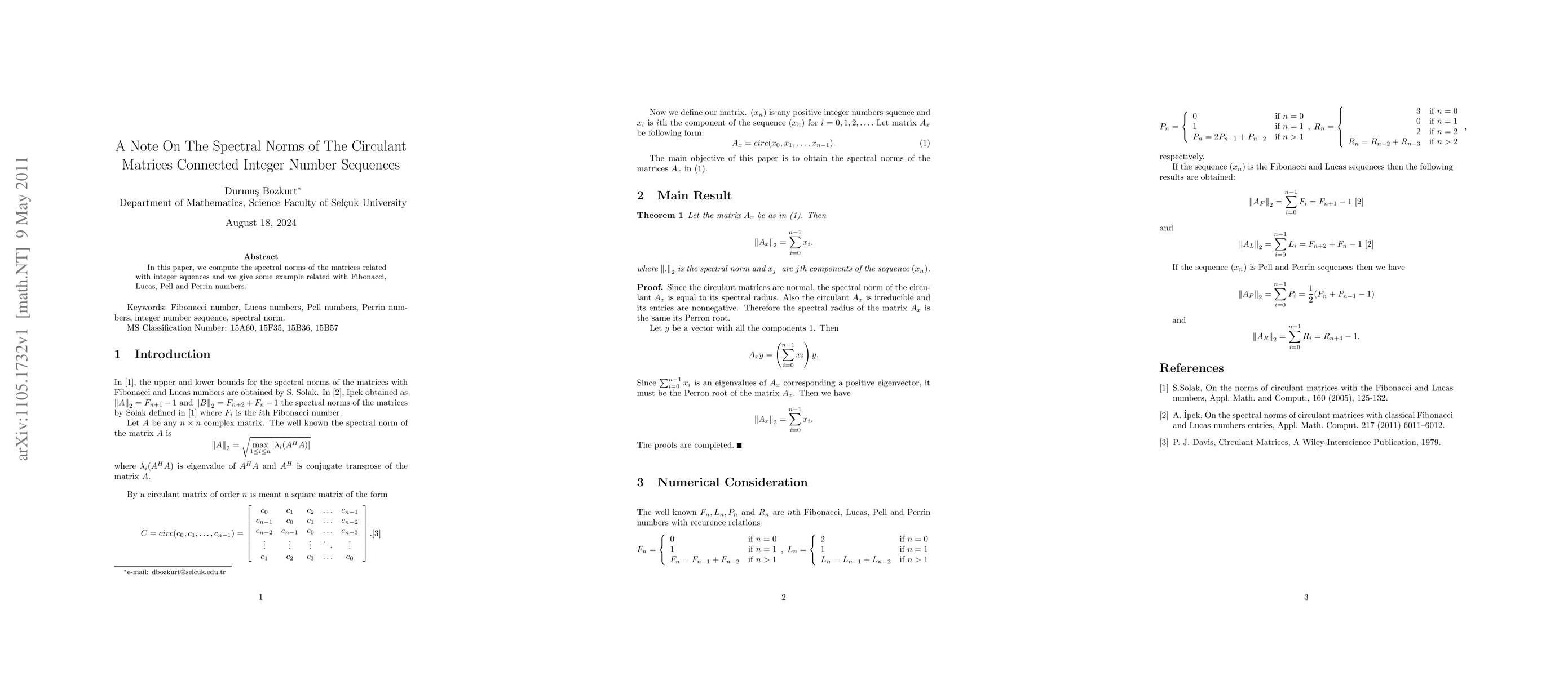 Summary: This paper calculates the spectral norms of circulant matrices associated with Fibonacci, Lucas, Pell, and Perrin integer sequences, providing examples to illustrate these computations.