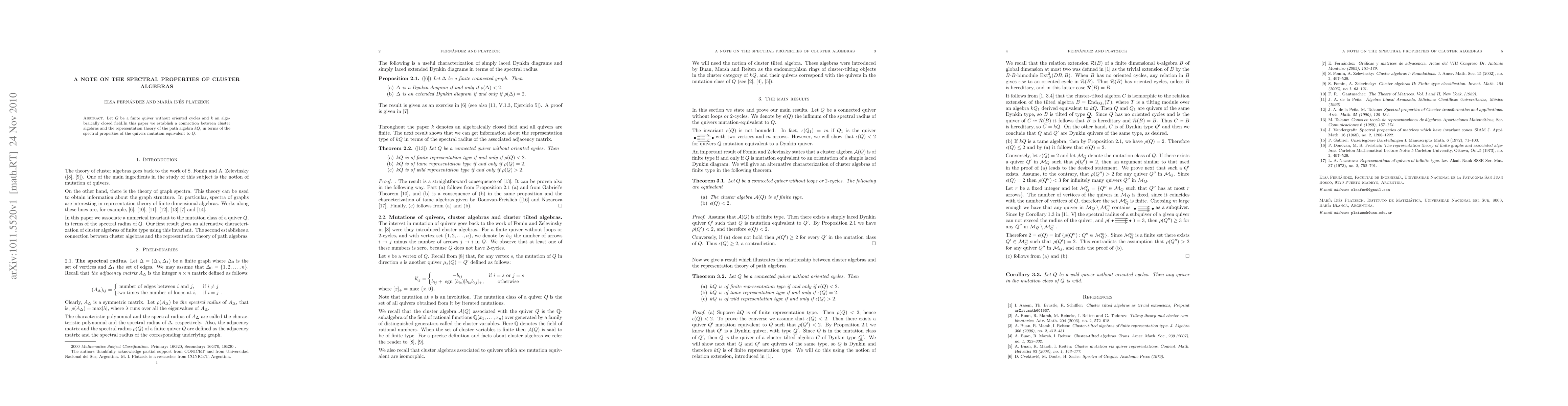 Let $Q$ be a finite quiver without oriented cycles and $k$ an algebraically closed field.In this paper we establish a connection between cluster algebras and the representation theory of the path algebra $kQ$, in terms of the spectral properties of the quivers mutation equivalent to $Q$.