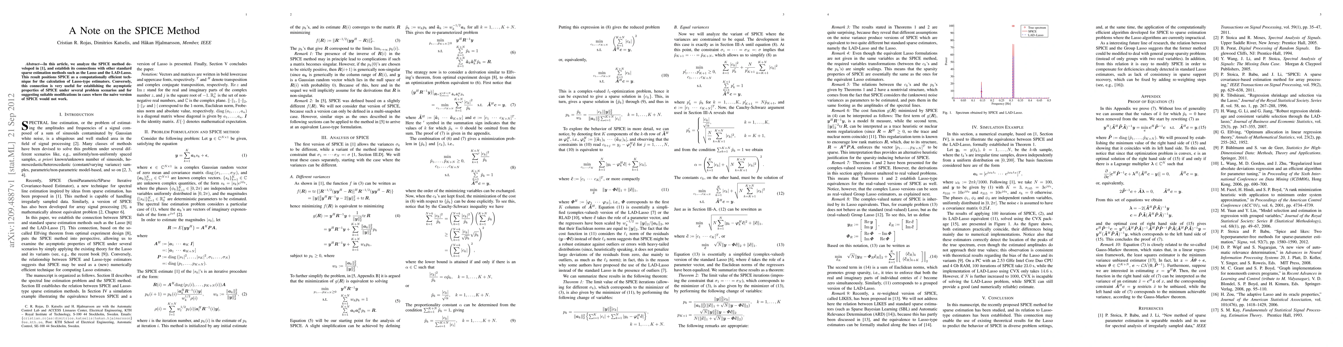 In this article, we analyze the SPICE method developed in [1], and establish its connections with other standard sparse estimation methods such as the Lasso and the LAD-Lasso. This result positions SPICE as a computationally efficient technique for the calculation of Lasso-type estimators. Conversely, this connection is very useful for establishing the asymptotic properties of SPICE under several problem scenarios and for suggesting suitable modifications in cases where the naive version of SPICE would not work.