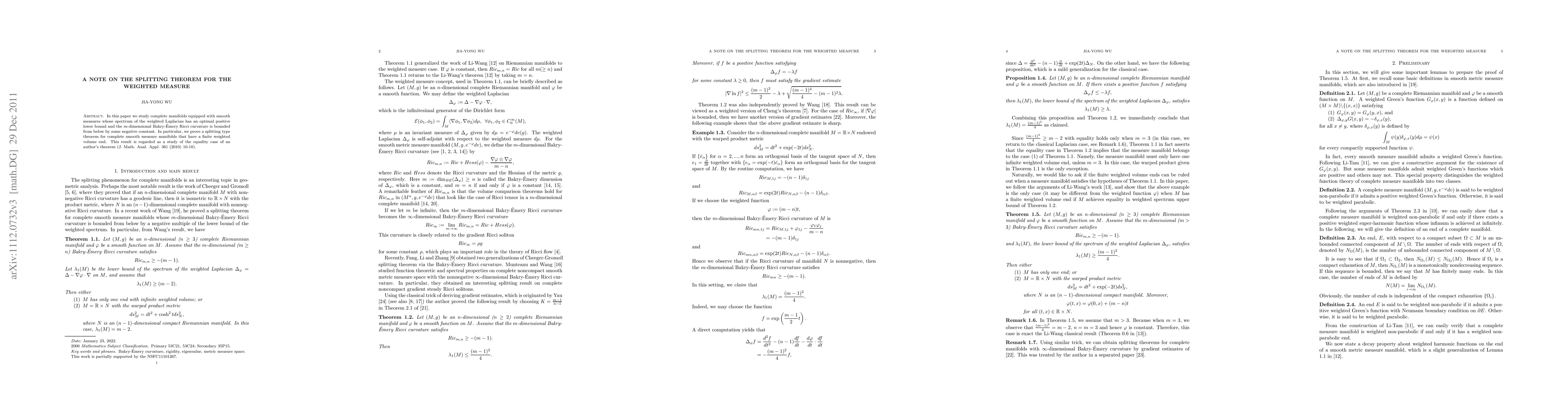 This paper proves a splitting theorem for complete smooth measure manifolds with a finite weighted volume end, showing that such manifolds split into connected components under certain conditions.