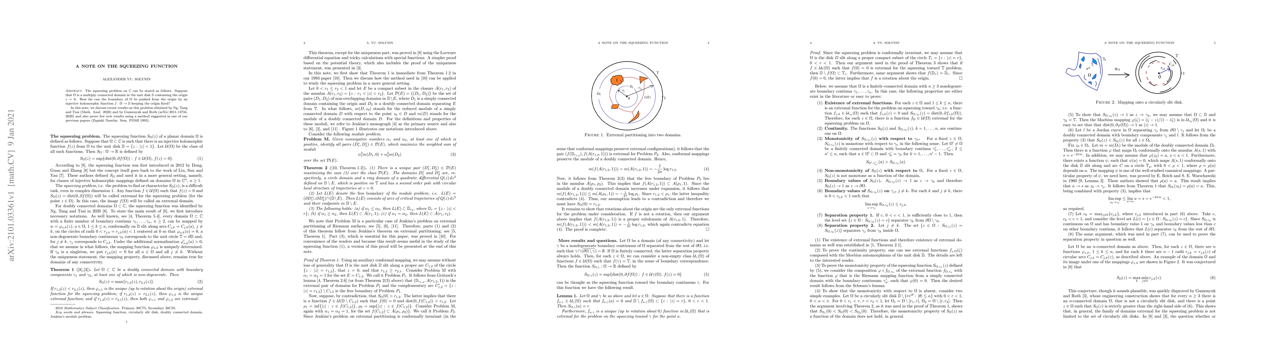 The squeezing problem on $\mathbb{C}$ can be stated as follows. Suppose that $\Omega$ is a multiply connected domain in the unit disk $\mathbb{D}$ containing the origin $z=0$. How far can the boundary of $\Omega$ be pushed from the origin by an injective holomorphic function $f:\Omega\to \mathbb{D}$ keeping the origin fixed? In this note, we discuss recent results on this problem obtained by Ng, Tang and Tsai (Math. Anal. 2020) and by Gumenyuk and Roth (arXiv:2011.13734, 2020) and also prove few new results using a method suggested in one of our previous papers (Zapiski Nauchn. Sem. POMI 1993).