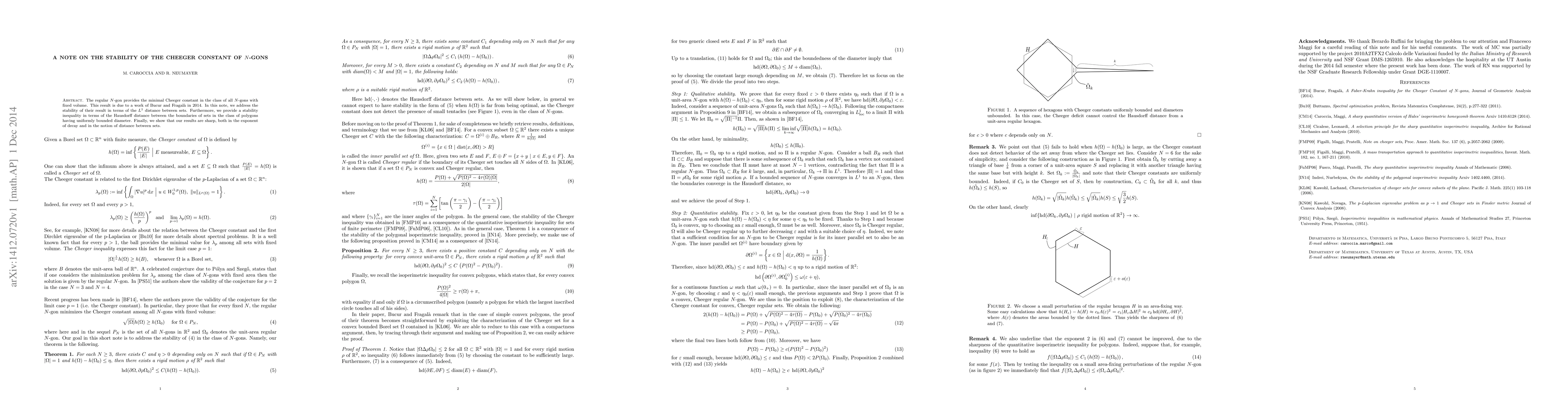 The regular $N$-gon provides the minimal Cheeger constant in the class of all $N$-gons with fixed volume. This result is due to a work of Bucur and Fragal\`a in 2014. In this note, we address the stability of their result in terms of the $L^1$ distance between sets. Furthermore, we provide a stability inequality in terms of the Hausdorff distance between the boundaries of sets in the class of polygons having uniformly bounded diameter. Finally, we show that our results are sharp, both in the exponent of decay and in the notion of distance between sets.