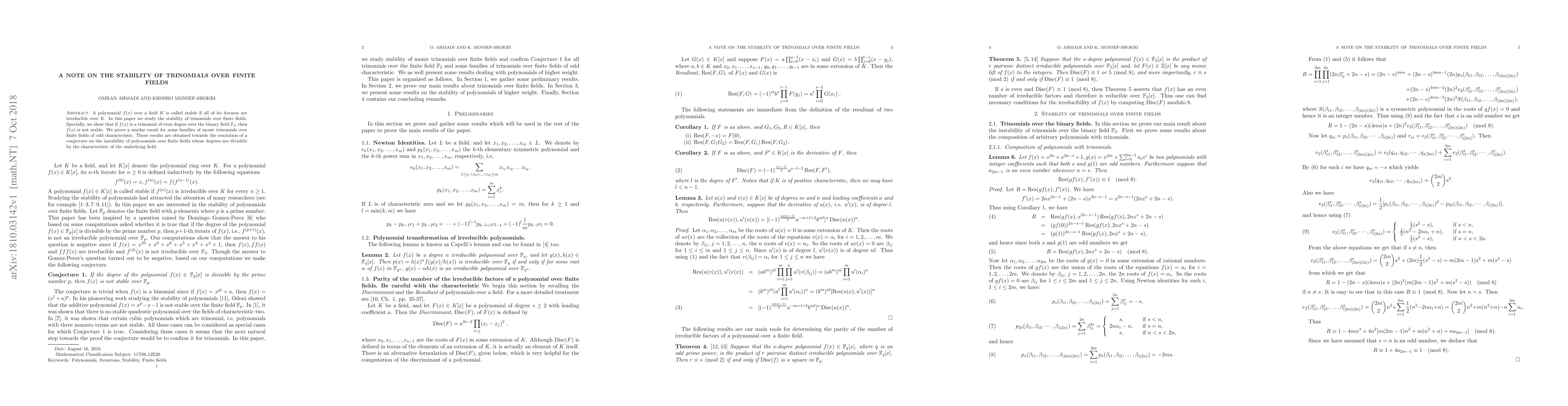 This paper investigates the stability of trinomials over finite fields, proving that trinomials of even degree over $\mathbb{F}_2$ and certain monic trinomials over fields of odd characteristic are not stable, supporting a conjecture about instability for polynomials whose degree is divisible by the field's characteristic.