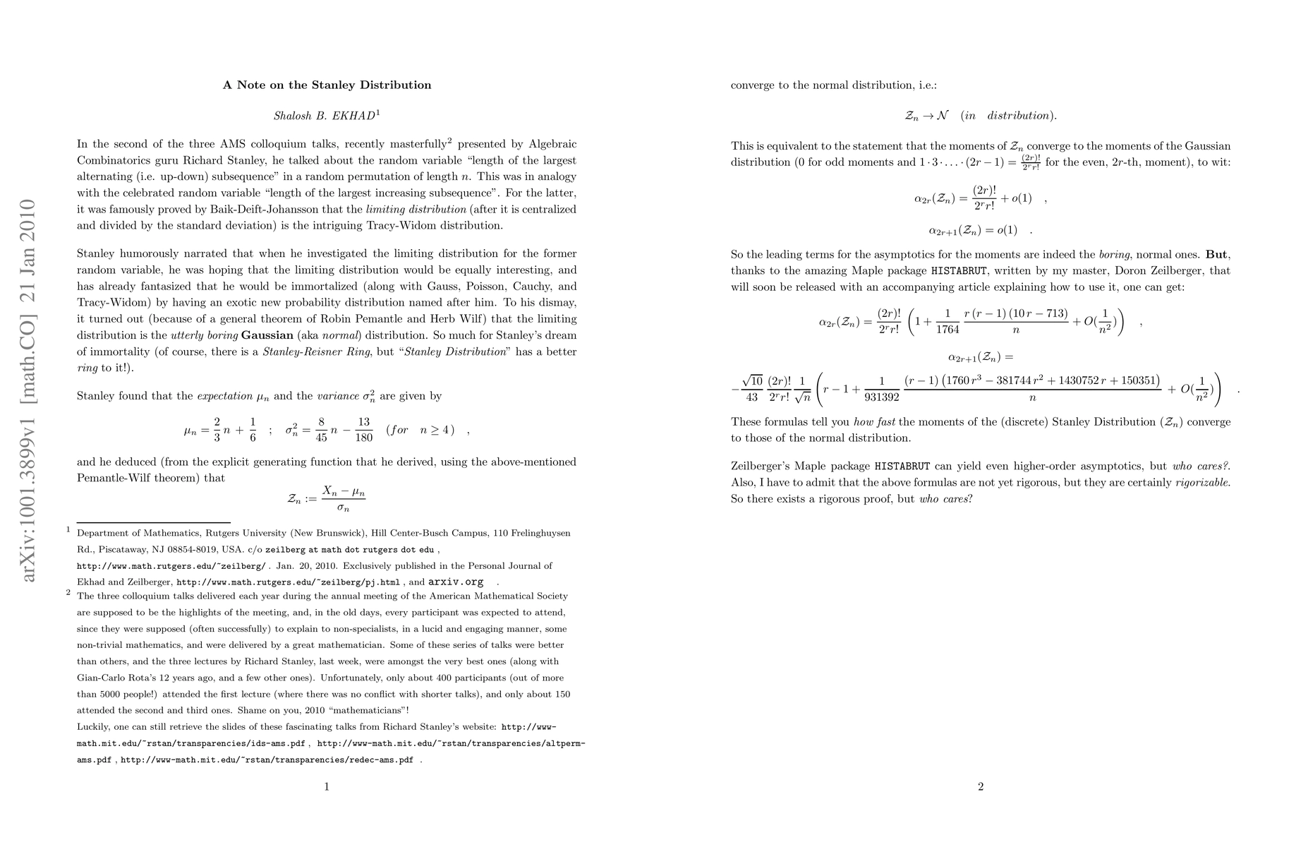 Richard Stanley proved that the centralized/normalized version of the random variable "length of largest up-down subsequence" in a random permutation of length n is asymptotically normal. We go beyond and present a more refined asymptotic formula for the moments.