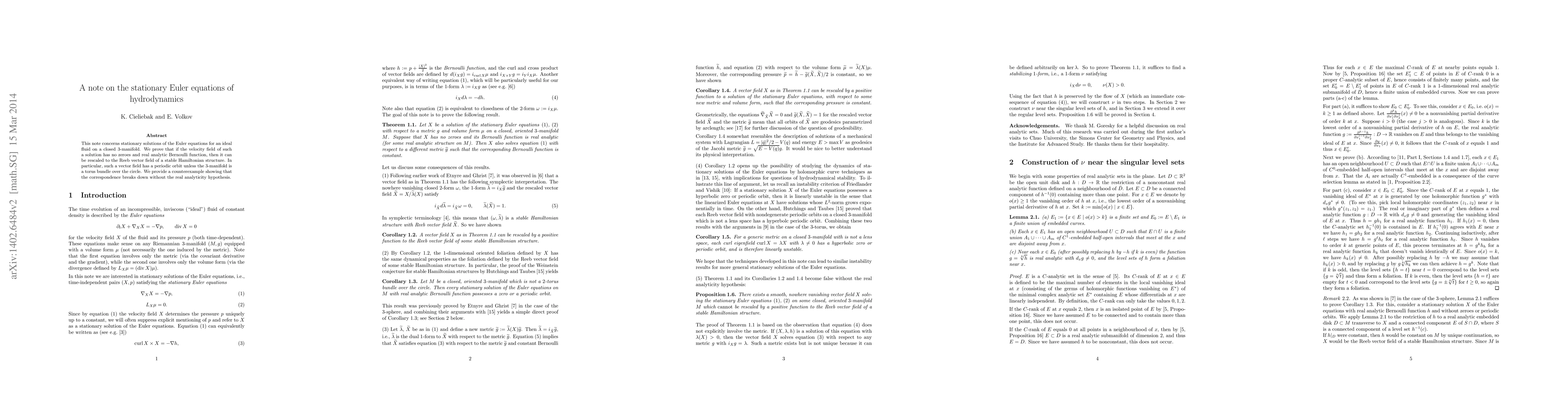 This note concerns stationary solutions of the Euler equations for an ideal fluid on a closed 3-manifold. We prove that if the velocity field of such a solution has no zeroes and real analytic Bernoulli function, then it can be rescaled to the Reeb vector field of a stable Hamiltonian structure. In particular, such a vector field has a periodic orbit unless the 3-manifold is a torus bundle over the circle. We provide a counterexample showing that the correspondence breaks down without the real analyticity hypothesis.