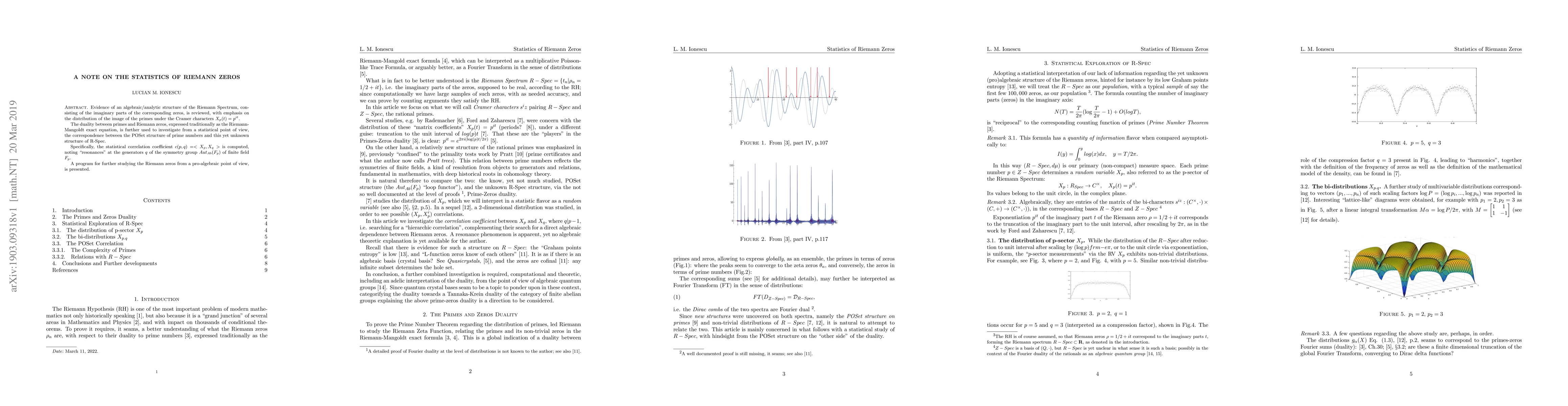 This paper explores the statistical structure of the Riemann zeros, focusing on the distribution of their imaginary parts and the correlation between primes and zeros. It investigates the duality between primes and zeros, computing statistical correlation coefficients and identifying "resonances" linked to the symmetry group of finite fields.
