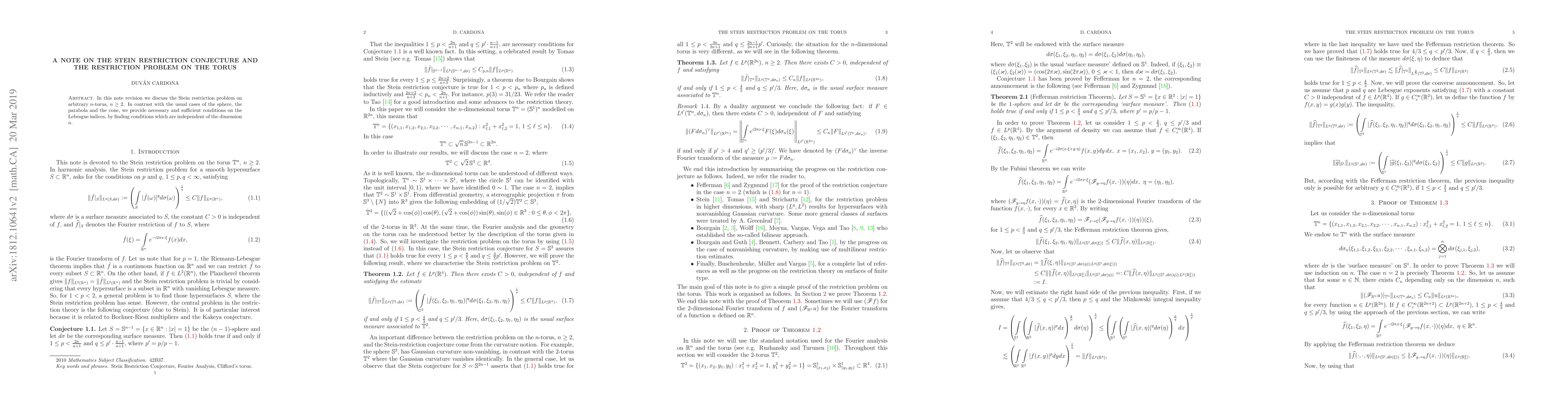 In this note we discuss the Stein restriction problem on arbitrary $n$-torus, $n\geq 2$. In contrast with the usual cases of the sphere, the parabola and the cone, we provide necessary and sufficient conditions on the Lebesgue indices, by finding conditions which are independent of the dimension $n$.