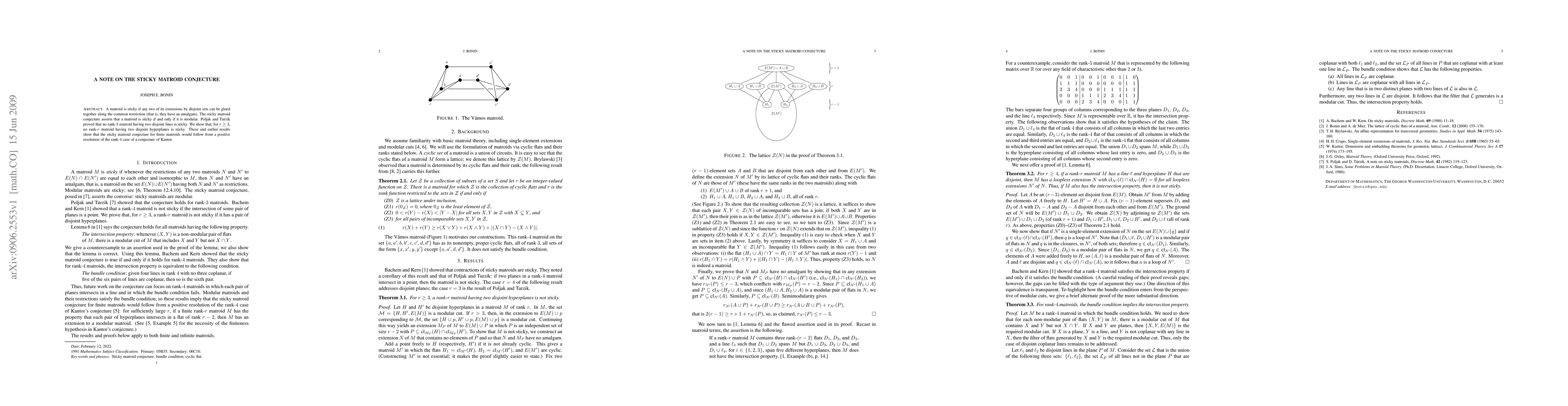 This paper investigates the Sticky Matroid Conjecture, which posits that a matroid is sticky if and only if it is modular. The authors demonstrate that no rank-r matroid with two disjoint hyperplanes is sticky for r ≥ 3, extending previous results and suggesting that resolving the conjecture may depend on solving the rank-4 case of a related Kantor conjecture.
