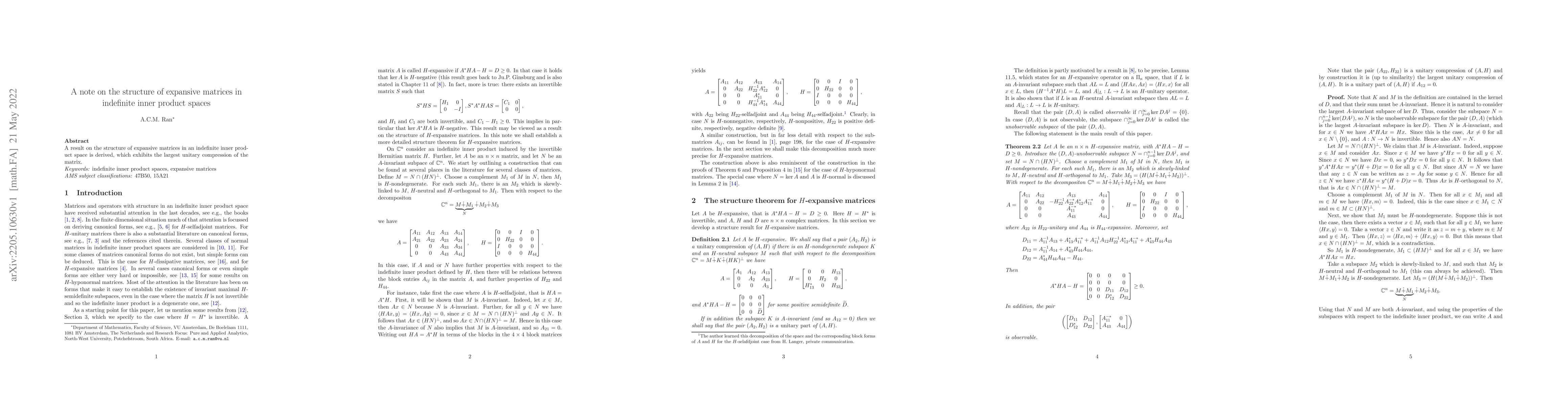 Summary: This paper derives a result on the structure of expansive matrices within indefinite inner product spaces, revealing the largest unitary compression of these matrices. The findings provide insight into the matrix's behavior under unitary transformations.