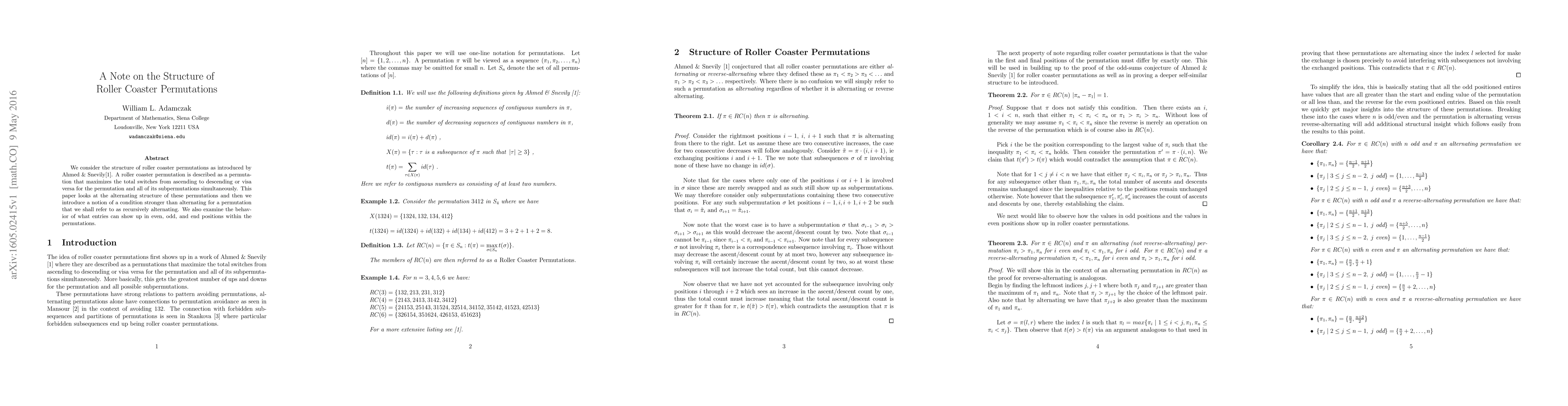 We consider the structure of roller coaster permutations as introduced by Ahmed & Snevily[1]. A roller coaster permutation is described as a permuta- tion that maximizes the total switches from ascending to descending or visa versa for the permutation and all of its subpermutations simultaneously. This paper looks at the alternating structure of these permutations and then we introduce a notion of a condition stronger than alternating for a permutation that we shall refer to as recursively alternating. We also examine the behav- ior of what entries can show up in even, odd, and end positions within the permutations.