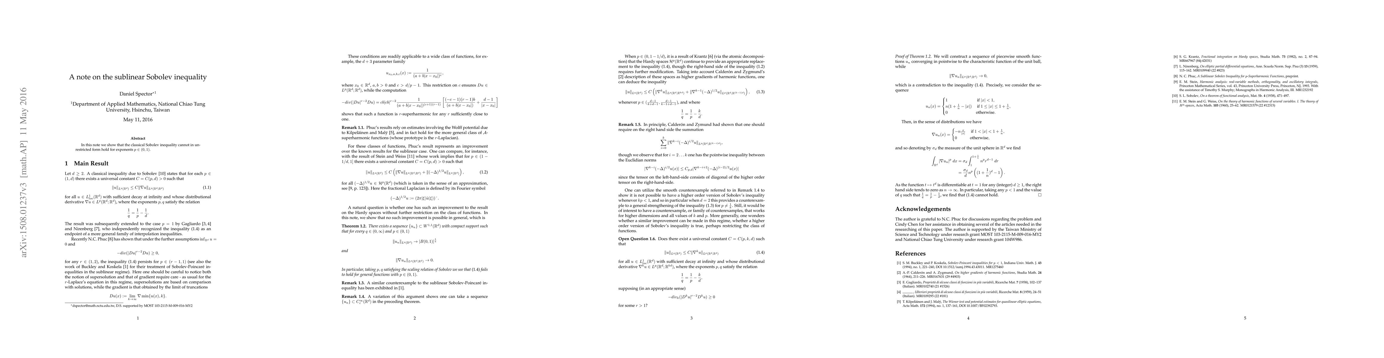 The research provides a new result on the sublinear Sobolev inequality, which shows that it cannot hold for exponents p ∈ (0, 1)