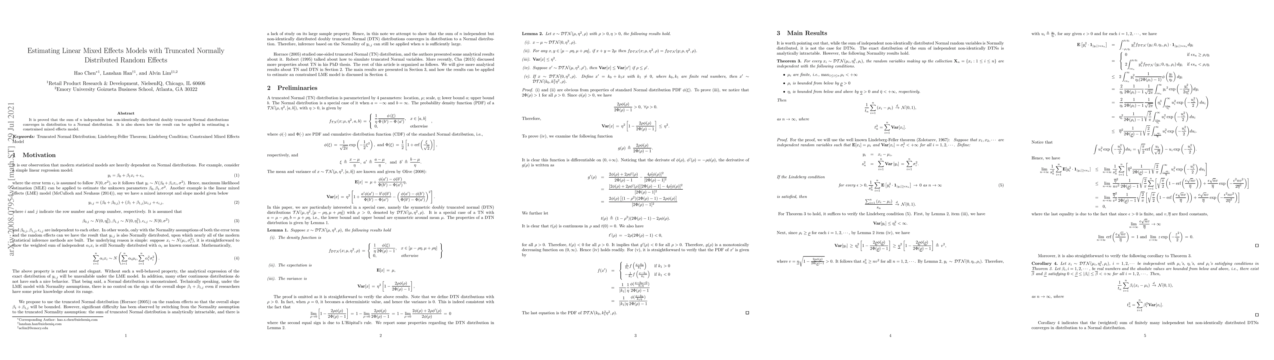 Summary: The paper proves that the sum of n independent, non-identically distributed doubly truncated Normal distributions converges to a Normal distribution. It further demonstrates the application of this result in estimating constrained mixed effects models.