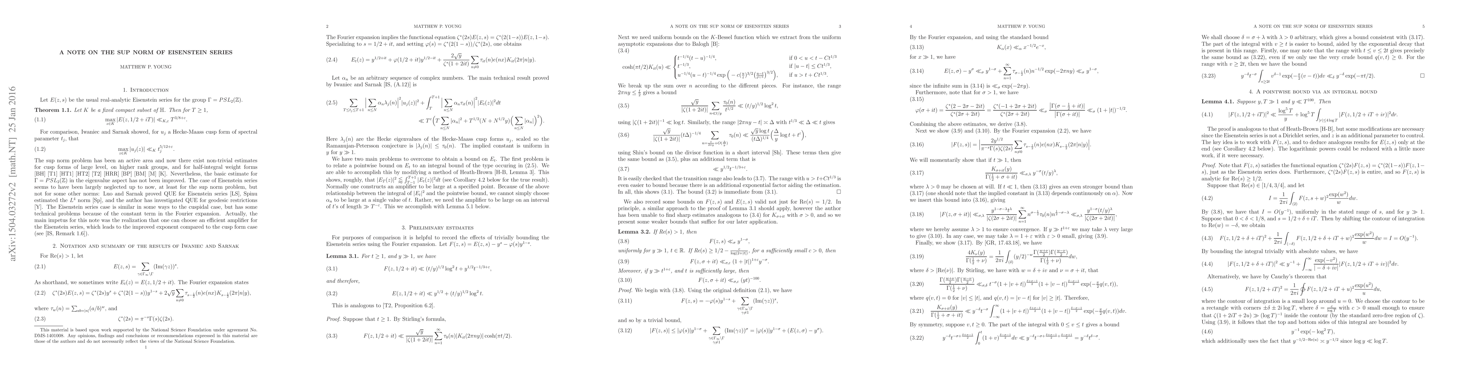 This research establishes a sup norm bound for real-analytic Eisenstein series, demonstrating that $E(z, 1/2 + iT) \ll T^{3/8 + \varepsilon}$ uniformly for $z$ in a specified compact subset of $\mathbb{H}$. The result highlights the growth rate of the Eisenstein series in this context.