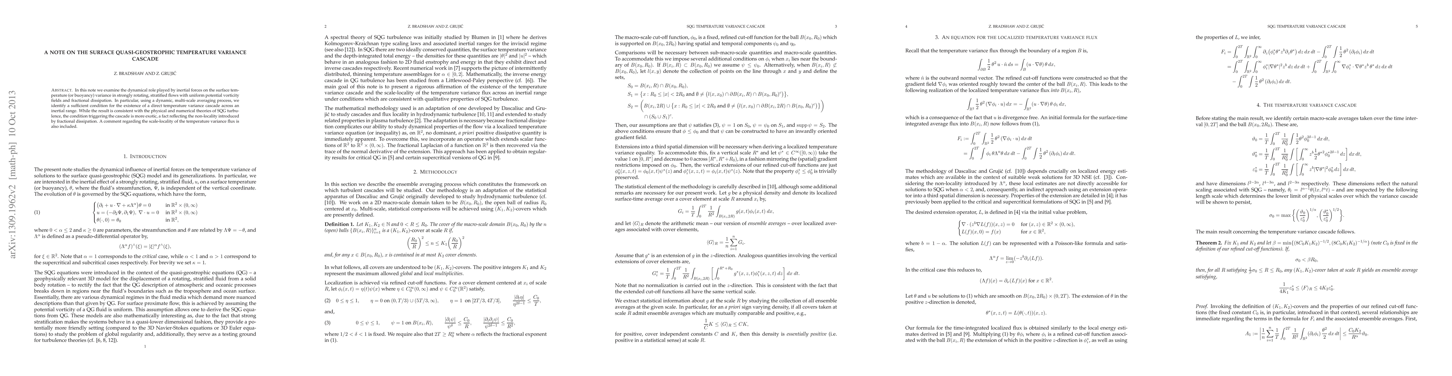 In this note we examine the dynamical role played by inertial forces on the surface temperature (or buoyancy) variance in strongly rotating, stratified flows with uniform potential vorticity fields. In particular, using a dynamic, multi-scale averaging process, we identify a sufficient condition for the existence of a direct temperature variance cascade across an inertial range. While the result is consistent with the physical and numerical theories of SQG turbulence, the condition which triggers the cascade is more exotic, a fact reflecting the non-locality introduced by fractional dissipation.