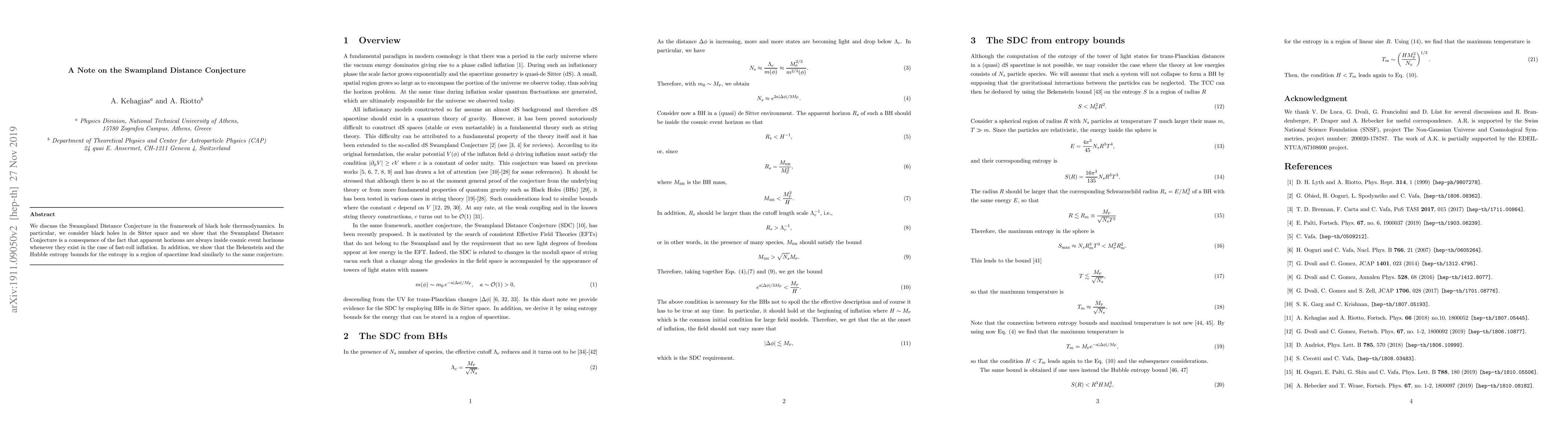 The Swampland Distance Conjecture emerges from black hole thermodynamics in de Sitter space, where apparent horizons are always inside cosmic event horizons during fast-roll inflation. The Bekenstein and Hubble entropy bounds also support this conjecture.