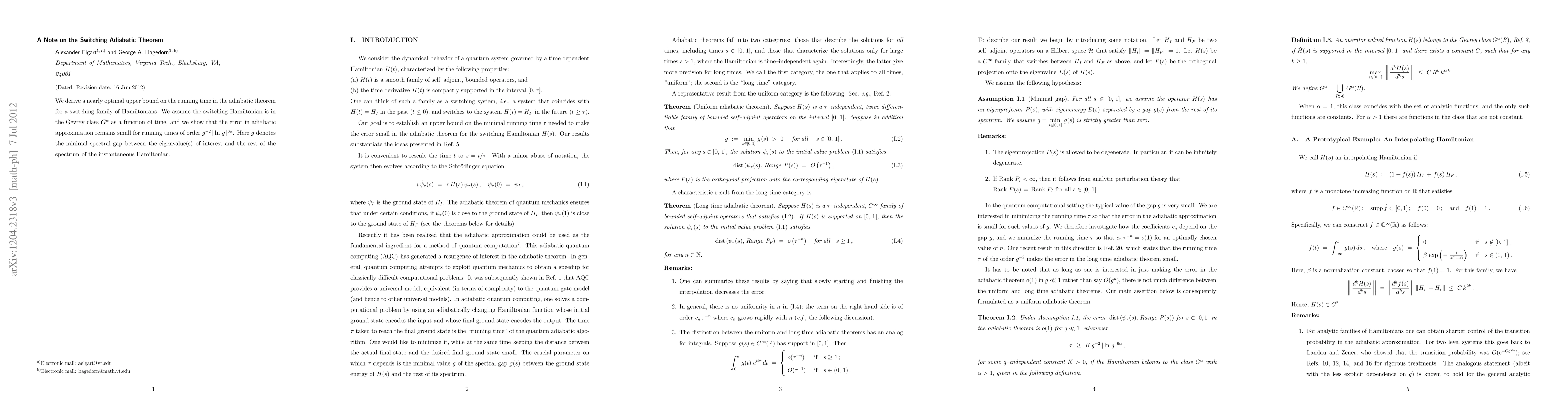 Researchers derived a nearly optimal upper bound on the running time for adiabatic approximation of switching Hamiltonians, showing that error remains small for times of order g^{-2}| ln g|^{6eta}, where g is the minimal spectral gap.