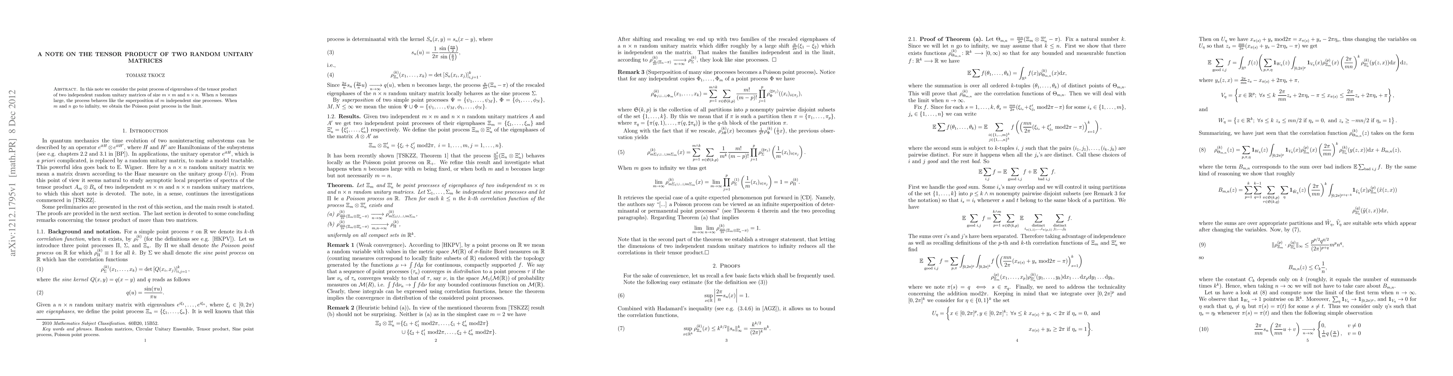 In this note we consider the point process of eigenvalues of the tensor product of two independent random unitary matrices of size m by m and n by n. When n becomes large, the process behaves like the superposition of m independent sine processes. When m and n go to infinity, we obtain the Poisson point process in the limit.